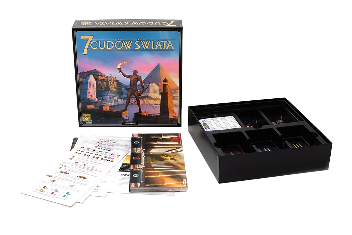 Pokaż, jakie cuda może zbudować Twoja cywilizacja! Zostań przywódcą jednego z siedmiu wielkich miast świata antycznego. Zbieraj surowce ze swoich ziem, weź udział w odwiecznym wyścigu cywilizacyjnym, nawiąż kontakty handlowe i stwórz militarną potęgę. Pozostaw ślad na kartach historii budując cud architektury, który przetrwa wieki! 7 cudów świata to świetnie zbalansowana gra o rozwoju cywilizacji, która łączy proste zasady i dynamiczną rozgrywkę z planowaniem i strategicznym myśleniem. Uczestnicy wcielają się w przywódców starożytnych miast, które starają się poprowadzić do jak najbardziej optymalnego rozwoju. Co wyróżnia nową edycję? Większe karty cudów ułatwiające odczytywanie i układanie kart. Nowy system ikon usprawniający rozgrywkę i pozwalający na jeszcze szybsze opanowanie zasad. Bardziej przejrzyste umiejscowienie ikon, dzięki któremu karty są czytelniejsze i łatwiejsze do zrozumienia. Przeredagowane zasady, jeszcze przystępniejsze dla nowych uczestników zabawy. Zrebalansowane karty i efekty. Pudełka poszczególnych tytułów dopasowane do siebie rozmiarem. Uwspółcześnione grafiki na okładkach a także nowe, stylowe logo. Liczba graczy 3-7 Wiek 10+