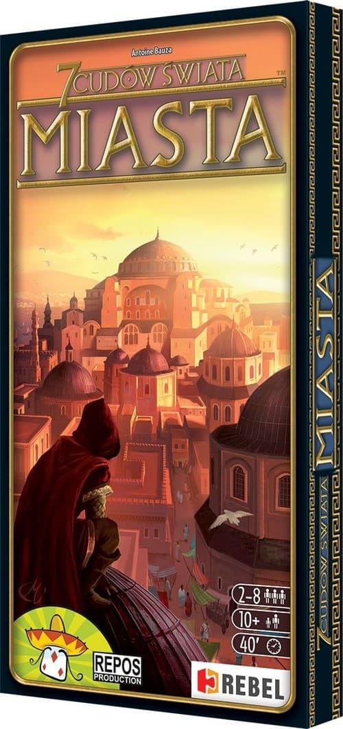 7 Cudów Świata: Miasta, drugi dodatek do 7 Cudów Świata, zawiera opcjonalne zasady gry zespołowej. Oferuje także nowy typ kart (czarne, reprezentujące pozostałości miast), nowe karty starych typów (dwa nowe cuda: Petra i Bizancjum, nową gildię i lidera powiązanego z czarnymi kartami). Dodatek ten jest dużo bardziej agresywny i wprowadza silną interakcję między graczami, którzy ciągle starają się zebrać więcej punktów niż przeciwnicy. Dzięki zasadom gry drużynowej do jednej partii może zasiąść aż osiem osób. Członkowie jednej drużyny siedzą obok siebie i wybierają karty, które przyniosą korzyść im obojgu. Nowe, czarne karty oddziaływują w różnoraki sposób, z czego dziewięć z nich dostępnych jest w każdej erze. Przykładowe efekty: Ambasady, które wykluczają cię z wyścigu zbrojeń w tej epoce. Cmentarze, za które dostajesz punkty na koniec gry, a pozostali gracze muszą za nie płacić. Szpiedzy, którzy kopiują symbole z kart nauki (zielonych). Czarny rynek, który podwaja surowiec. Zdolność budowania kart za darmo dzięki skopiowanu zależności budynków od innych graczy. Liczba graczy: 2 - 8 osób Wiek: od 10 lat Czas gry: ok. 30 minut