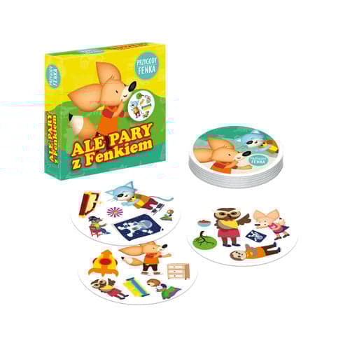 Zawartość opakowania: karty koła – 31 szt., instrukcja Gry z Fenkiem – przyjemne z pożytecznym W opakowaniu znajdziemy zestaw 31 kart z 6 obrazkami na każdej z nich. Dwie dowolne karty zawsze mają po jednym wspólnym obrazku, ale żeby nie było zbyt łatwo, obrazki te często mają różną wielkość. Gra polega na jak najszybszym znalezieniu wspólnego obrazka. W zależności od wariantu wygrywa ten, kto zdobędzie najwięcej kart, bądź jak najszybciej pozbędzie się wszystkich. Warianty gry: STOS - Zasady gry Tasujemy karty i rozdajemy po jednej każdemu graczowi. Gracze układa je przed sobą obrazkami do dołu. Pozostałe karty układamy w stos obrazkami do góry. Start gry Na hasło „start” każdy gracz odsłania swoją kartę. Kto pierwszy odnajdzie wspólny obrazek na swojej karcie i karcie leżącej na szczycie stosu oraz prawidłowo nazwie wspólną ilustrację, zdobywa kartę ze stosu i kładzie ją przy sobie. Kto wygrywa? Wygrywa ten, kto zgromadzi najwięcej kart. WIEŻA - Zasady gry Na środku umieszczamy jedną kartę obrazkami do góry. Wszystkie pozostałe karty rozdajemy graczom, którzy układają je przed sobą w stos obrazkami do dołu. Start gry Na hasło „start” każdy gracz odsłania kartę leżącą na górze swojego stosu. Kto pierwszy odnajdzie wspólny obrazek na swojej karcie i tej umieszczonej pośrodku oraz prawidłowo go nazwie, odkłada swoją kartę na środek. Kto wygrywa? Wygrywa ten, kto pierwszy pozbędzie się wszystkich kart.