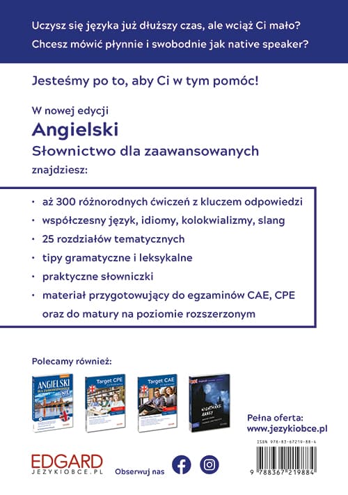 • Jeśli chcesz posługiwać się angielskim jak native speaker i wypowiadać się na każdy temat z pewnością i swobodą, sięgnij po nowe wydanie książki Angielski Słownictwo dla zaawansowanych. To doskonała pomoc dla wszystkich osób na poziomie B2+ / C1 samodzielnie uczących się angielskiego chcących osiągnąć biegłość językową i poziom C2.