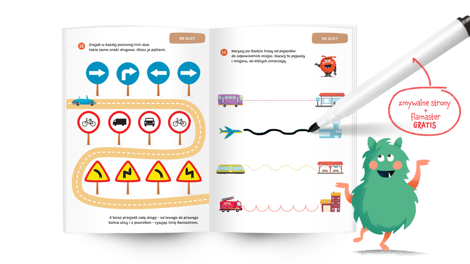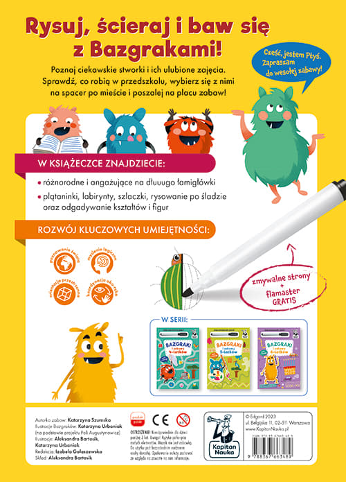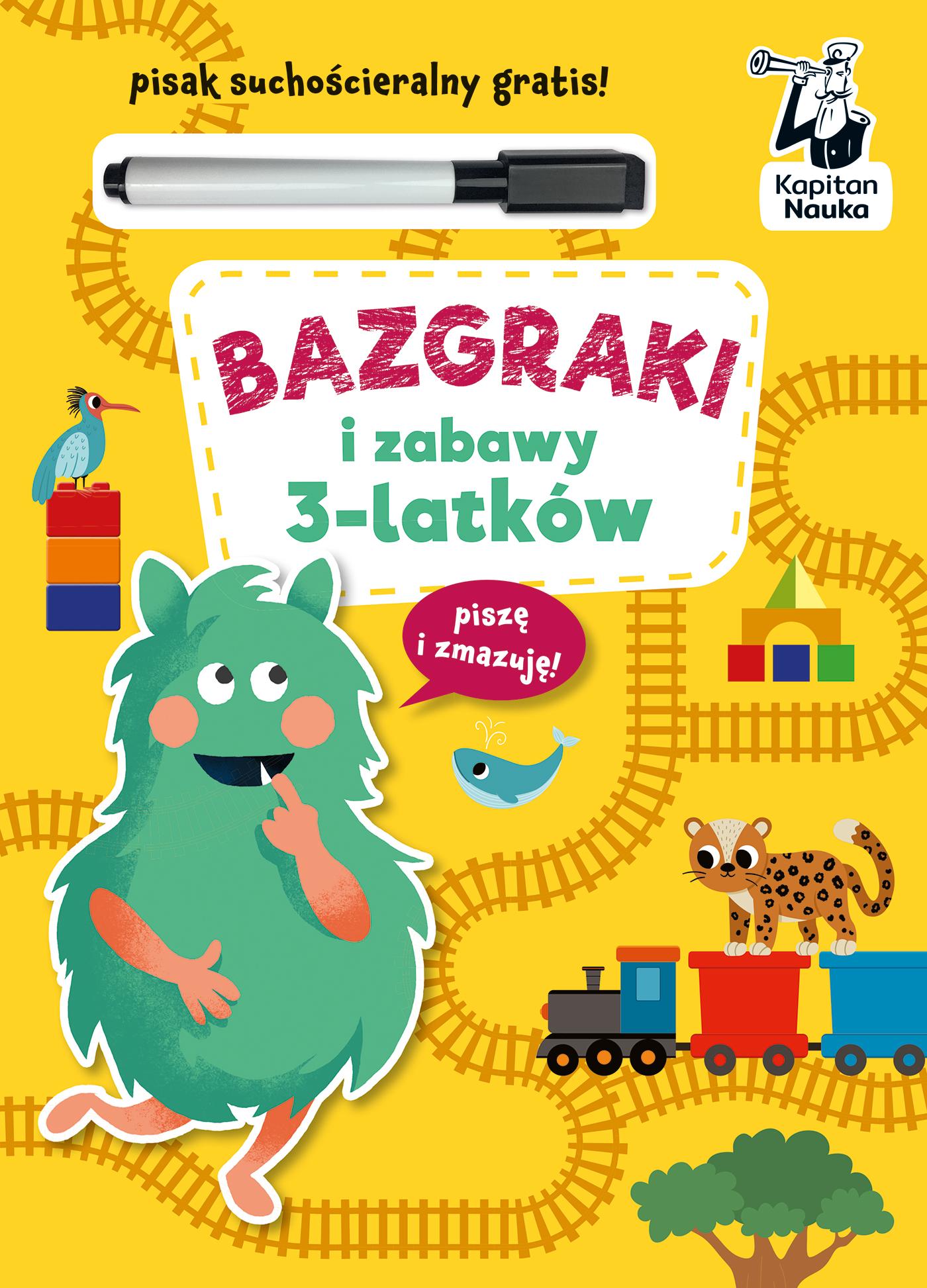Bazgraki i zabawy 3-latków Rozwijające zabawy z pisakiem suchościeralnym! Jaki kształt ma piaskowa babka? Co przyda się na spacer w deszczu? Które pojazdy można spotkać na placu budowy? Bazgraki i zabawy dla 3-latków to pomysł na rozwijające łamigłówki, dzięki którym młodsze przedszkolaki trenują myślenie logiczne, umiejętność rozpoznawania kształtów i figur geometrycznych oraz ćwiczą rękę, rysując po śladzie i przechodząc labirynty. Różnorodne zadania przygotowują do nauki pisania, rozwijają koncentrację i spostrzegawczość, a także ćwiczą pamięć wzrokową i orientację w przestrzeni. Oryginalne i zabawne ilustracje oswajają młodsze przedszkolaki z nowymi miejscami, takimi jak przedszkole, miasto czy sklep, lub przypominają o dobrze znanym otoczeniu. Dzięki dołączonemu do książki flamastrowi suchościeralnemu odpowiedzi można zmazywać i poprawiać bez końca, a wygodny, duży format A4 pozwala na swobodne rysowanie i bazgranie. Rysuj, ścieraj i baw się z Bazgrakami! Liczba stron: 24 Zawartość: książka + flamaster suchościeralny Cena zestawu: 26,90 zł Marka: Kapitan Nauka Edgard, Warszawa czerwiec 2023 Format: 210x297 mm ISBN: 978-83-67663-48-9 W serii „Bazgraki i zabawy”: • Bazgraki i zabawy 4-latków • Bazgraki i zabawy 5-latków • Bazgraki i zabawy 6-latków • Więcej informacji na www.KapitanNauka.pl Kapitan Nauka jest również na facebooku: www.facebook.com/KapitanNauka Instagram: @kapitan_naukaSzczegółowe informacje na temat książki Bazgraki i zabawy 3-latków