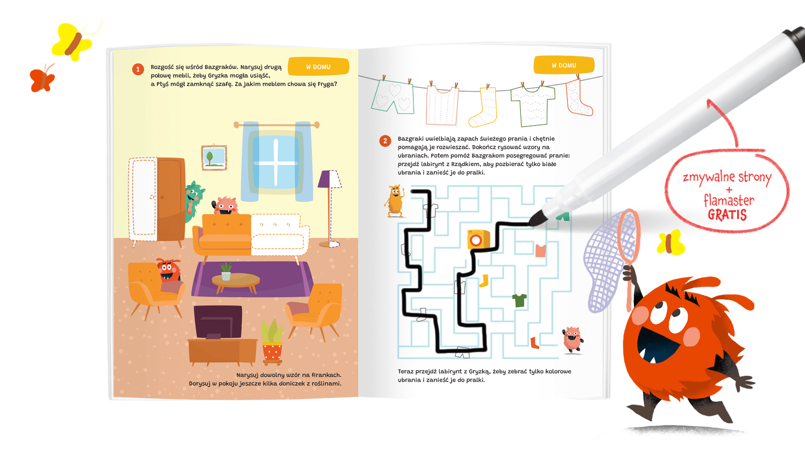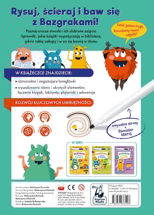 Bazgraki i zabawy 4-latków Rozwijające zabawy z pisakiem suchościeralnym! Czym różnią się rysunki? Które sprzęty na placu zabaw wybrały Bazgraki? Co wyjdzie z połączenia kropek? Bazgraki i zabawy dla 4-latków to rozwijające łamigłówki, dzięki którym przedszkolaki trenują myślenie logiczne, umiejętność segregowania i układania sekwencji oraz ćwiczą rękę, rysując po śladzie i przechodząc labirynty. Różnorodne zadania przygotowują do nauki pisania, rozwijają koncentrację i spostrzegawczość, a także ćwiczą pamięć wzrokową i orientację w przestrzeni. Oryginalne i zabawne ilustracje oswajają przedszkolaki z nowymi miejscami, takimi jak przedszkole, dom, park, biblioteka czy sklep, lub przypominają o dobrze znanym otoczeniu. Dzięki dołączonemu do książki flamastrowi suchościeralnemu odpowiedzi można zmazywać i poprawiać bez końca, a wygodny, duży format A4 pozwala na swobodne rysowanie i bazgranie. Rysuj, ścieraj i baw się z Bazgrakami!Szczegółowe informacje na temat książki Bazgraki i zabawy 4-latków