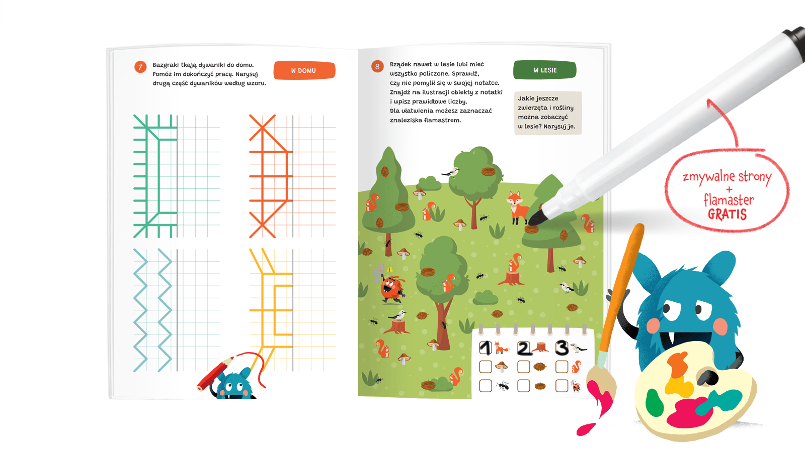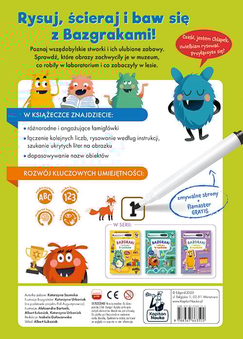 Bazgraki i zabawy 5-latków Rozwijające zabawy z pisakiem suchościeralnym! Co można zobaczyć w muzeum? Które przedmioty zaczynają się na tę samą głoskę? Ile sprzętów brakuje w laboratorium Bazgraków? Bazgraki i zabawy dla 5-latków to rozwijające łamigłówki, dzięki którym przedszkolaki trenują myślenie logiczne, poznają litery i cyfry oraz ćwiczą rączkę, zamalowując właściwe pola z liczbami i literami oraz łącząc kropki. Różnorodne zadania przygotowują do nauki pisania i liczenia, rozwijają koncentrację i spostrzegawczość, a także ćwiczą pamięć wzrokową i orientację w przestrzeni. Oryginalne i zabawne ilustracje oswajają przedszkolaki z nowymi miejscami, takimi jak muzeum, gabinet lekarski czy laboratorium, lub przypominają o dobrze znanym otoczeniu. Dzięki dołączonemu do książki flamastrowi suchościeralnemu odpowiedzi można zmazywać i poprawiać bez końca, a wygodny, duży format A4 pozwala na swobodne rysowanie i bazgranie. Rysuj, ścieraj i baw się z Bazgrakami!Szczegółowe informacje na temat książki Bazgraki i zabawy 5-latków