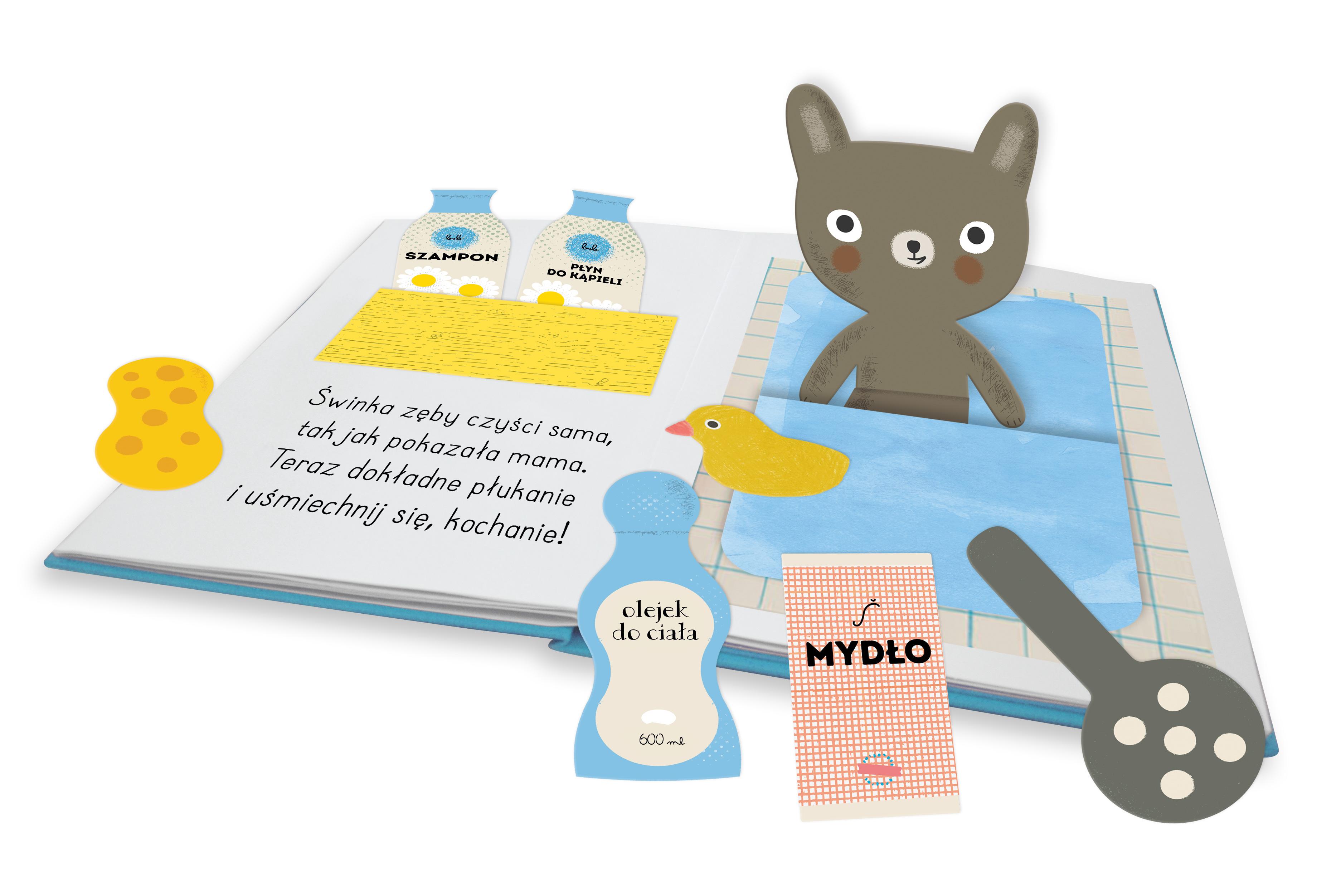 Dudusie bawiły się w parku, a teraz nadszedł czas, aby wrócić do domu i się wykąpać. Młodzi czytelnicy będą towarzyszyć Króliczkowi, Kotkowi, Śwince i Misiowi podczas kąpieli, czesania i suszenia włosów, mycia zębów, obcinania pazurków i innych czynności higienicznych. Kartonowa książeczka zawiera wyjmowane postacie i mnóstwo akcesoriów. Rymowana opowiastka sprawi, że mycie i związane z nim rytuały będą również świetną zabawą! Świnka, Królik, Kotek, Miś muszą się wykąpać dziś. Każdy z nich do wanny wskoczy. Potrzebują twej pomocy!