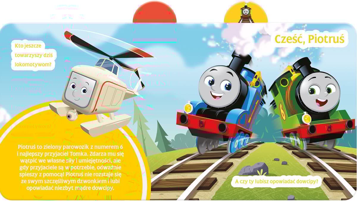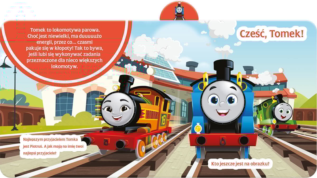 Wyjątkowa w formie kartonowa książka dla fanów serialu Tomek i przyjaciele! Na dziesięciu stronach książeczki znalazły się fakty i ciekawostki dotyczące Tomka i jego towarzyszy z wyspy Sodor – Piotrusia, Kamci, Nii, Diesla, Bruna, Gabrysia oraz Sandry. Urocze portrety postaci zostały umieszczone na wystających z książki registrach, czyli niewielkich zakładkach. Dzięki temu maluch bez trudu znajdzie stronę z opisem ulubionego bohatera lub bohaterki. Teksty w książeczce są proste i zrozumiałe dla dzieci. Duża czcionka ułatwia naukę liter, a w przypadku dzieciaków, które rozpoznają już zapisane wyrazy – próby samodzielnego czytania. Mocne, kartonowe strony wytrzymają wiele dziecięcych eksperymentów, a dzięki zaokrąglonym rogom książka jest bezpieczna dla malucha. Duży format i wyraźne, przemawiające do wyobraźni młodego czytelnika ilustracje pozwolą wykorzystać książeczkę na różne sposoby – można ją czytać albo tylko oglądać, szukać na obrazkach szczegółów, liczyć elementy ilustracji, rzeczy w wybranym kolorze, zwierzaki chmurki lub inne drobiazgi i bawić się bez końca.