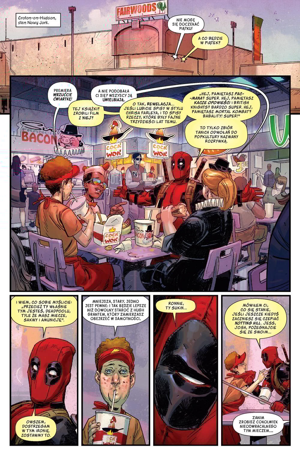 Po tym, jak Wade Wilson srodze rozczarował się życiem superbohatera, wykasował sobie pamięć i wrócił do tego, w czym jest najlepszy – najemnikowania! Niestety doskwiera mu brak zleceń, a co za tym idzie – gotówki, wpada więc na pomysł, by zaaranżować własny komiksowy event. Problem w tym, że Avengers nie są zbyt chętni do współpracy. Poszukując łatwiejszych okazji do zarobku, Deadpool trafia do Dziwoświata, odpiera hordy zombie w galerii handlowej i… cierpi na straszną chandrę. Na szczęście w pobliżu są zabójcy gotowi szybko go z niej wyleczyć! Autorem tej opowieści jest Skottie Young („Nienawidzę Baśniowa”), a rysunki stworzyli Scott Hepburn i Nic Klein („Thor”). Album zawiera zeszyty #1–6 serii „Deadpool”.Szczegółowe informacje na temat książki Deadpool. Tom 1. Najemnika śmierć nie tyka