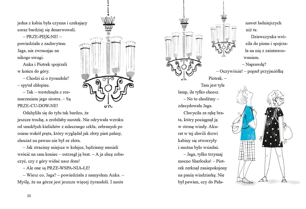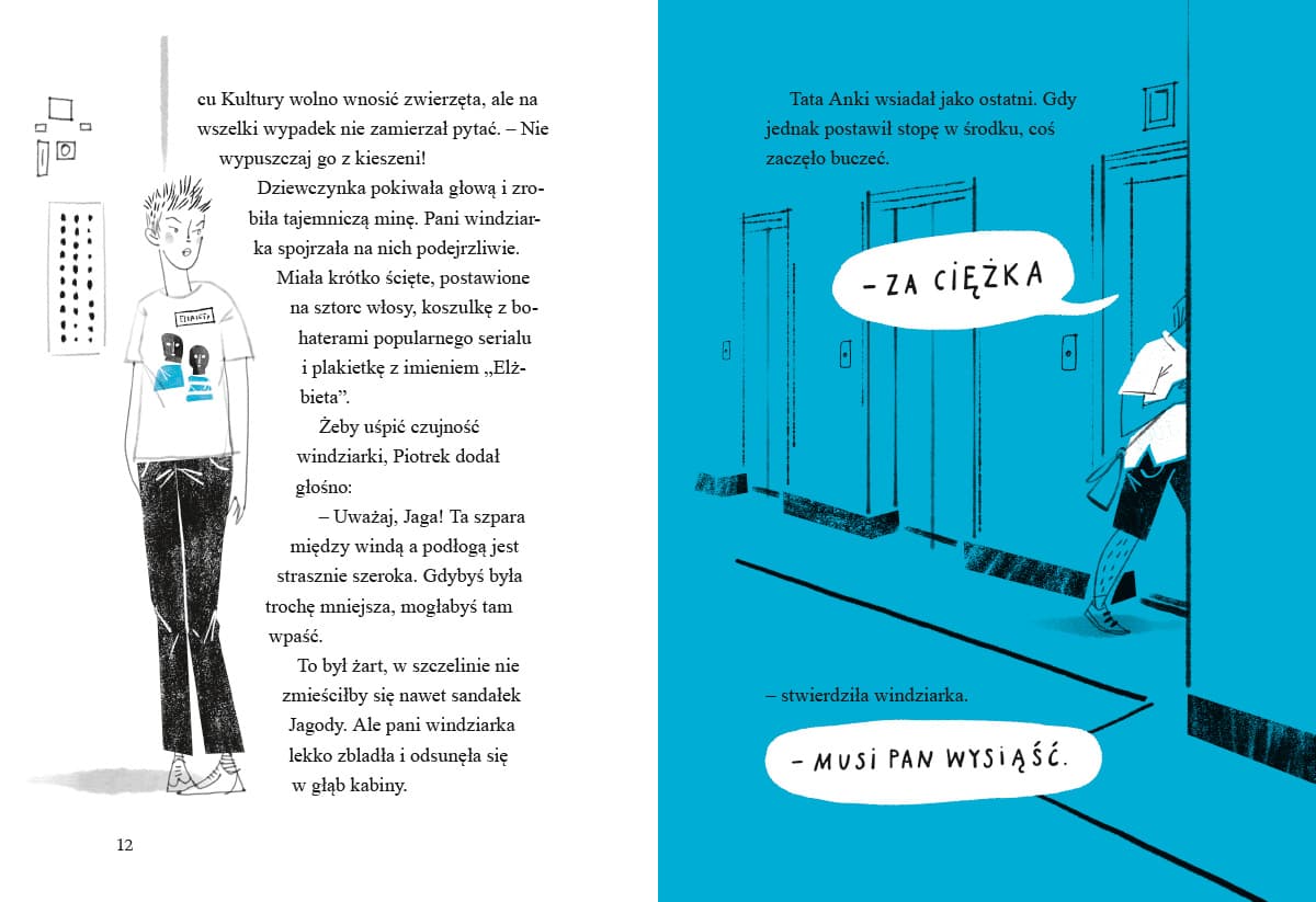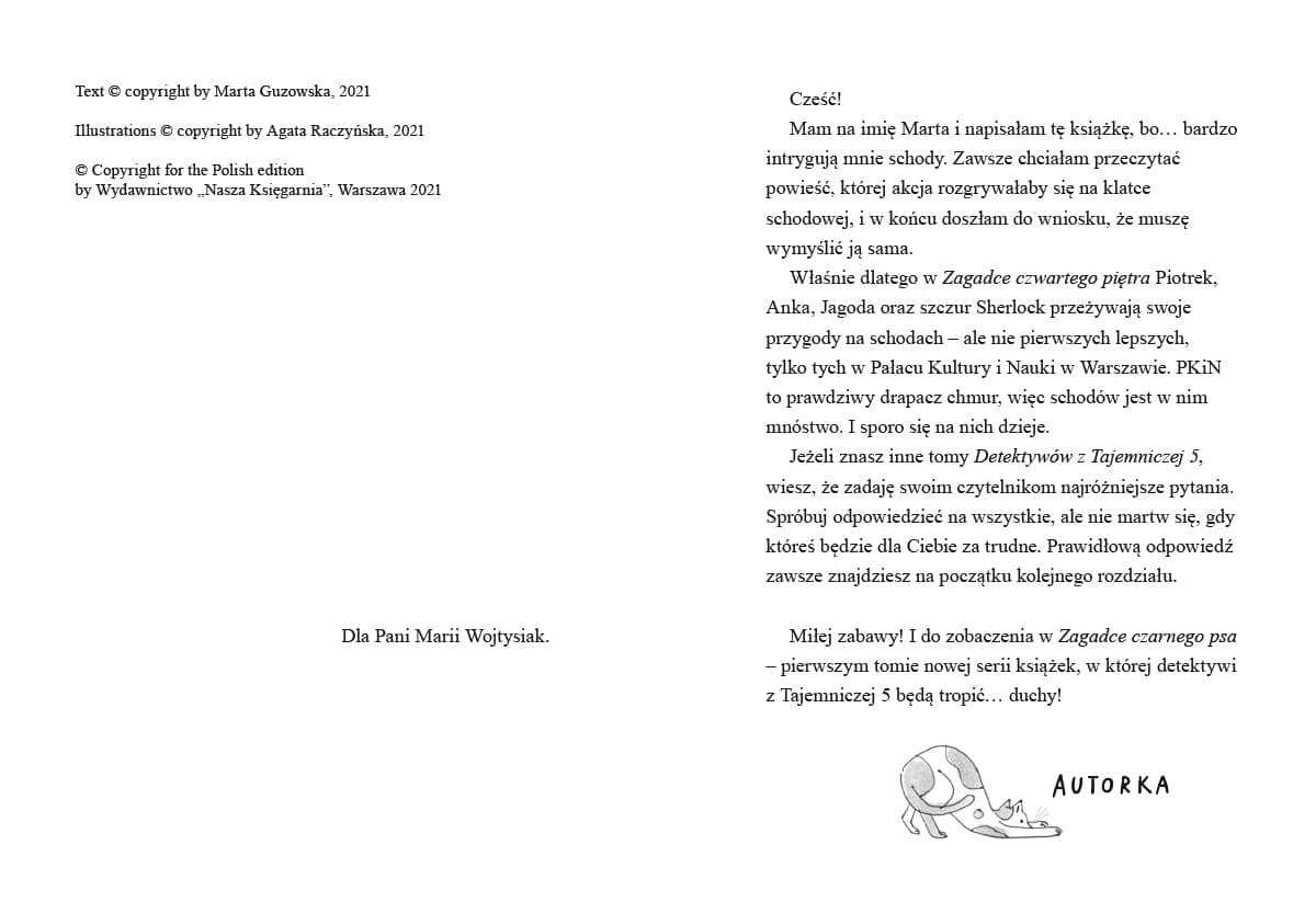 Siódmy tom serii detektywistycznej o młodych śledczych z Tajemniczej 5! Czy tajemnica może się kryć na… schodach? Oczywiście! Zwłaszcza że chodzi o schody w budynku tak niesamowitym jak Pałac Kultury i Nauki. Gdy niespodziewanie dochodzi tam do awarii windy, Anka, Piotrek i Jaga (w towarzystwie szczura Sherlocka oraz pani kustoszki) muszą wrócić na dół na piechotę. W dodatku z trzydziestego piętra! Nie jest to takie proste, tym bardziej że na czwartym piętrze coś ich zatrzymuje. Zdumiewająca kradzież, która nie ma najmniejszego sensu… „Detektywi z Tajemniczej 5” zostali wymyśleni na wyraźne życzenie dzieci Marty Guzowskiej – dotąd autorki powieści kryminalnych dla dorosłych. Seria książek o śledztwach Anki i Piotrka łączy przygodową fabułę, elementy wiedzy o nauce i sztuce oraz interaktywną formę, gdyż każdy tom wymaga od czytelnika logicznego myślenia i rozwiązywania zagadek. Marta Guzowska planuje przeżyć dziewięć żyć – jak kot. Na razie ma na koncie trzy: jest archeolożką, pisarką i mamą. Za swoje powieści kryminalne i sensacyjne dla dorosłych otrzymała cztery nominacje do Nagrody Wielkiego Kalibru oraz nagrodę główną. „Detektywi z Tajemniczej 5” to jej pierwsza seria książek dla najmłodszych. Według samej autorki „dla dzieci pisze się o wiele trudniej, bo mają detektor ściemy”. Agata Raczyńska jedną ręką głaszcze swoje alpaki, a drugą rysuje. Całe szczęście, że ma dwie ręce i nie musi wybierać… Spośród zilustrowanych przez nią książek z największym uznaniem spotkały się dotąd „Gry i zabawy z dawnych lat” (2016). Zdobyły wyróżnienie w konkursie PTWK Najpiękniejsze Książki Roku, nominację do Pióra Fredry oraz nominację w konkursie Książka Roku Polskiej Sekcji IBBY.