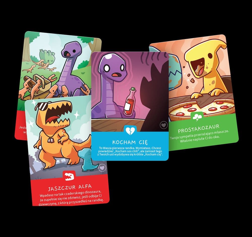 Uwaga! To nie jest samodzielna gra! Do rozgrywki wymagana jest podstawowa wersja gry: Dinokalipsa. Wiesz, co jest gorsze od spadającego meteorytu? Pierwsza randka. Zwłaszcza jeśli przychodzisz na nią tylko Ty, bo druga osoba postanowiła Cię wystawić. Chociaż z drugiej strony może to nawet lepsza opcja niż spotkać na swojej drodze żerozaura, który w kółko gada, że chciałby Cię schrupać, albo usłyszeć słynne „zostańmy przyjaciółmi”. Dinokalipsa: Koszmarne randki to rozszerzenie wprowadzające 54 zupełnie nowe karty z katastrofami (i nie tylko!), które zabiorą Cię do krainy żenujących wspomnień. Zakochaj się bez wzajemności, daj się złowić na nieprawdziwe zdjęcie i spotkaj się z dinozaurem, który zbyt szybko mówi „Kocham Cię!”. Oj, niezręcznie... Czym jest Dinokalipsa? To strategiczna gra karciana twórcy Odjechanych Jednorożców! Podczas zabawy jesteś dinozaurem, a życie co chwilę daje Ci w kość. Zrobisz wszystko, co w Twojej mocy, aby uniknąć katastrof naturalnych, drapieżnych i emocjonalnych, wymijając przy tym meteoryty i, tak jak w prawdziwym życiu, zapewne poniesiesz porażkę. Ale nie poddawaj się, bo pierwszy dinozaur, który zdobędzie 50 punktów (albo ostatni dinozaur w grze), zwycięży! Wiek graczy:8+ Liczba graczy: 2-4 Czas rozgrywki: 30-60 minut