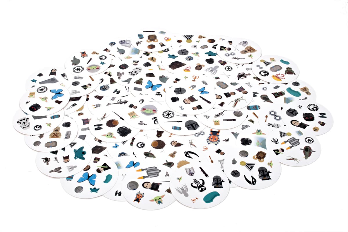 Szukaj par wśród postaci z serialu The Mandalorian! Zabierz bohaterów takich jak Mandalorian, Grogu, Ahsoka Tano czy Kuiil gdzie tylko zechcesz i baw się, szukając par w popularnej grze towarzyskiej! Spójrz na pierwszą kartę, którą trzymasz w ręku oraz na tę, która leży na środku stołu. Znajdź na nich wspólny obrazek, nazwij go i szybko pozbądź się swojej karty. Teraz następna! Tylko nie zwątp, dwie karty zawsze łączą się dokładnie jednym symbolem!