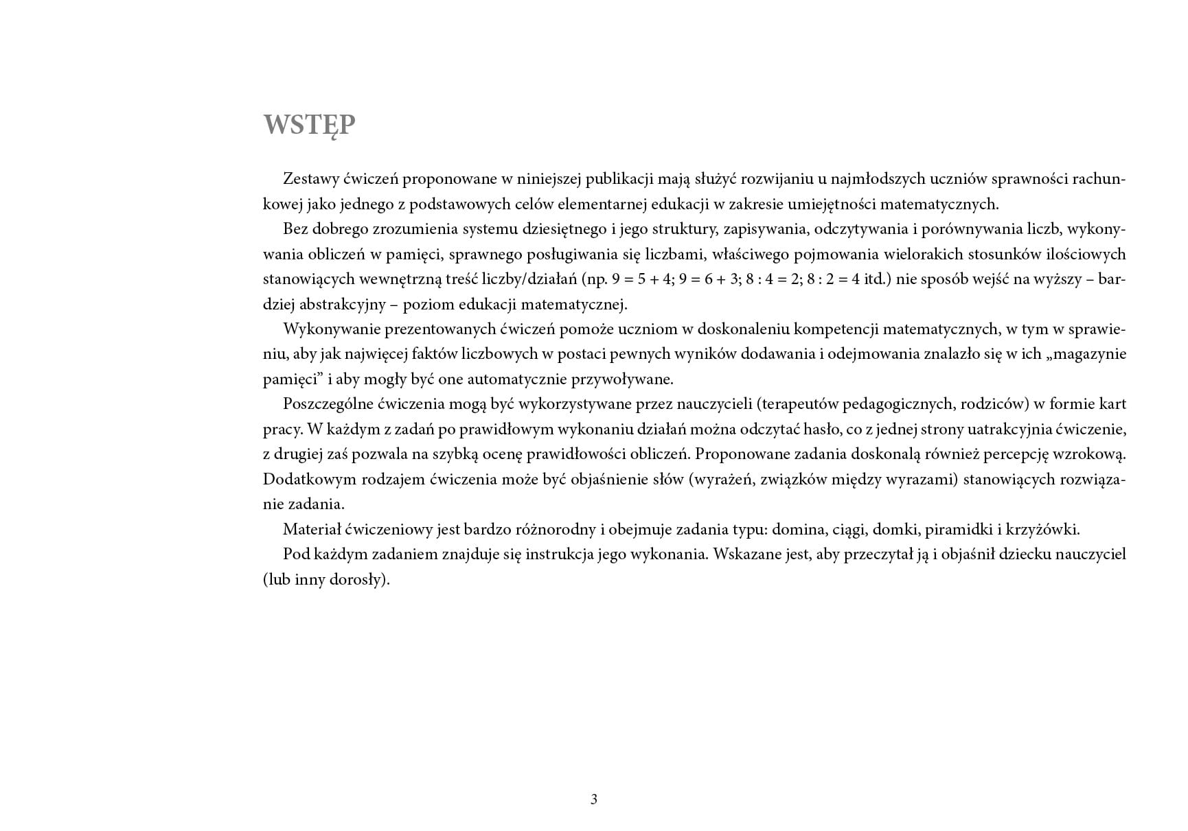 Zestawy ćwiczeń proponowane w niniejszej publikacji mają służyć rozwijaniu u najmłodszych uczniów sprawności rachunkowej jako jednego z podstawowych celów elementarnej edukacji w zakresie umiejętności matematycznych.