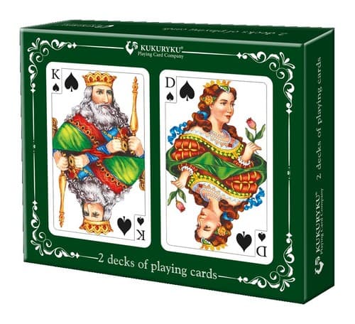 Gry karciane doskonalą umiejętność logicznego myślenia. Zestaw zawiera dwie talie po 54 karty do gry.