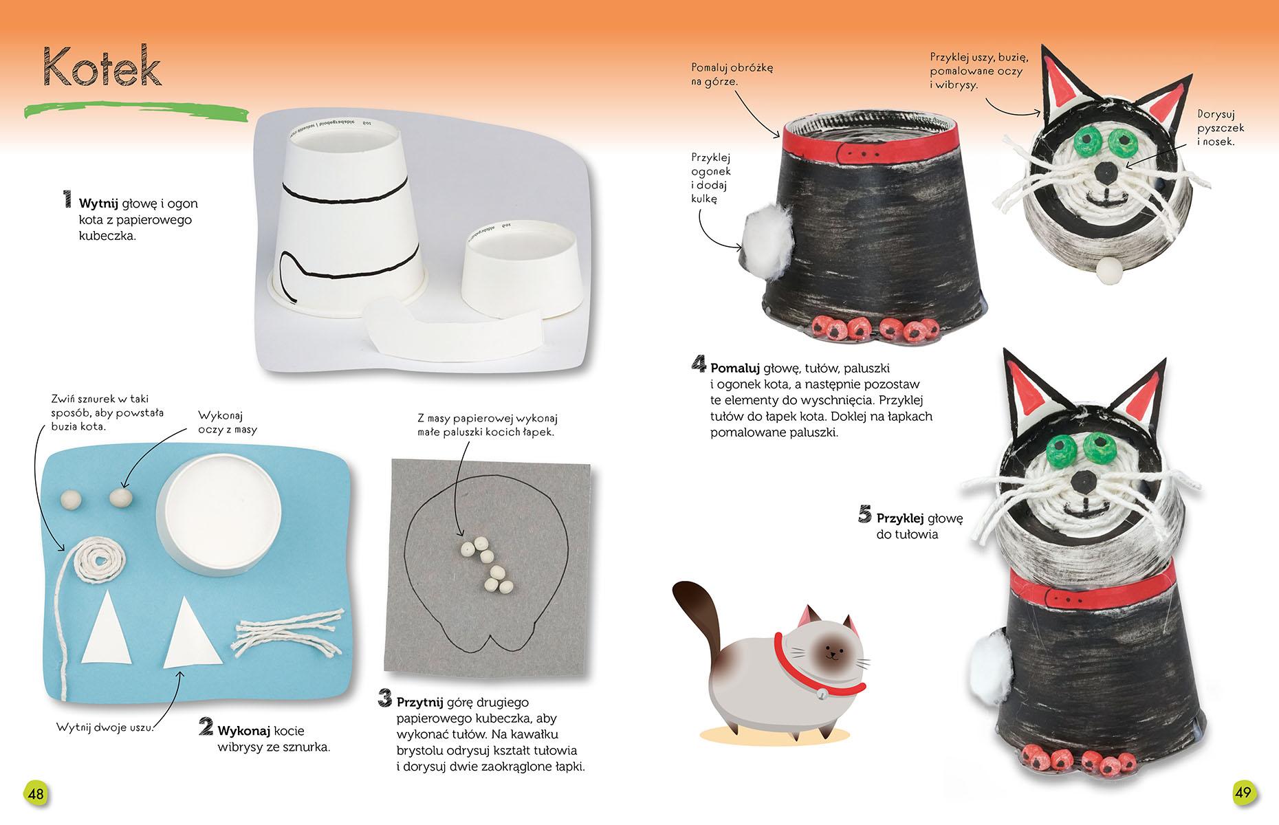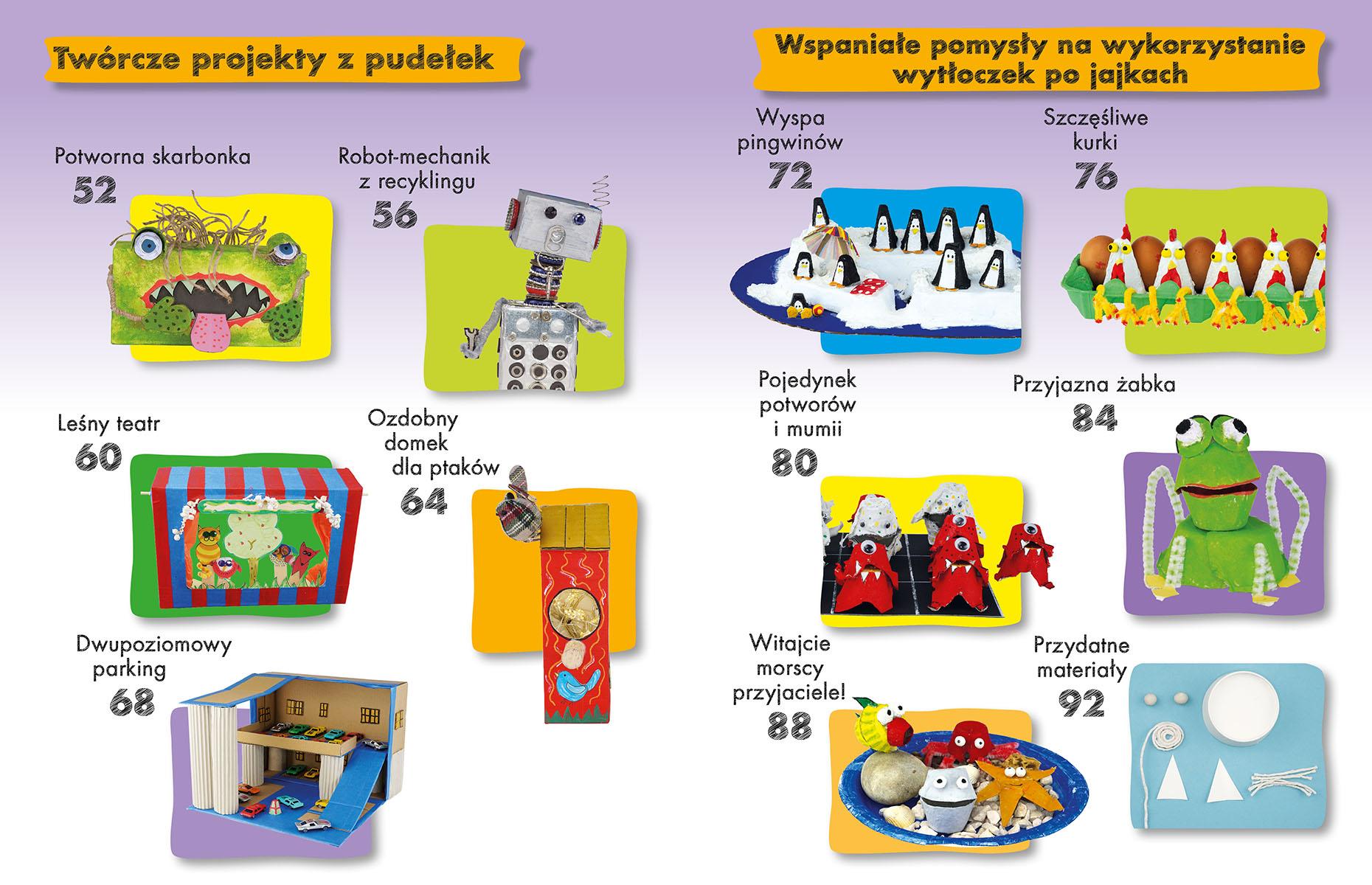 Ta książka zaprasza dzieci, nauczycieli i rodziców do fenomenalnej zabawy ze… śmieciami! Tak, dobrze przeczytaliście. Jej kolorowe strony podpowiadają, w jaki sposób tworzyć prawdziwą ekosztukę z niby-śmieci. Jak się przygotować do tych kreatywnych działań? To proste! Zbierajcie nieużywane papierowe kubki i talerze. Nie wyrzucajcie rolek po ręcznikach papierowych i pudełek po jajkach. A gdy już zgromadzicie swoje niby-śmieci, z pomocą prostych pomysłów zamieszczonych w tej książce, zamieńcie je m.in. w: – pingwina z pudełka po jajkach – dinozaura z papierowych talerzy – żyrafę i zebrę z rolek po ręcznikach papierowych – teatr leśny z nieużywanych pudełek! Dzięki tej książce każdy nauczyciel (w przedszkolu i szkole) będzie rozwijał talenty plastyczne swoich uczniów, ćwiczył z podopiecznymi motorykę małą, organizował kreatywne lekcje ekologii i świetnie się bawił, tworząc z małymi artystami prawdziwe dzieła ekosztuki. Mali artyści, do dzieła!