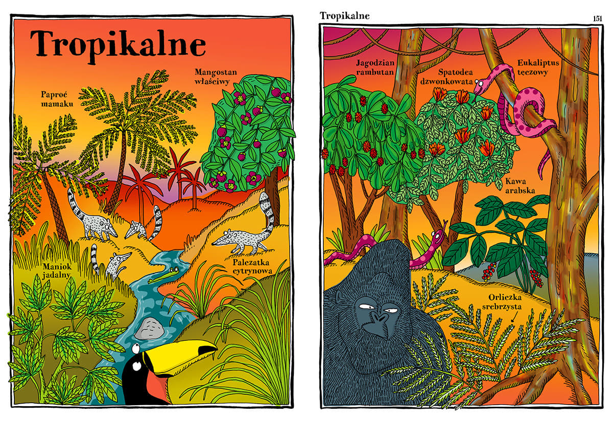 Fantastycznie kolorowa i pełna humoru rysunkowa encyklopedia roślin. W tym zielonym gąszczu niejedno was zaskoczy! Elegantki i śmierdzielki, twardzielki i plażowiczki, olbrzymki i prawdziwe gwiazdy, pachnące i kolczaste, egzotyczne i te zupełnie zwyczajne. W tej fantastycznie kolorowej i pełnej humoru encyklopedii roślin można znaleźć ponad 700 znanych i mniej znanych gatunków roślin podzielonych na różne grupy – czasem zabawne, a czasem całkiem serio. Które lubią wodę, a które świetnie się czują na pustyni? Które jadamy na obiad, a od których lepiej trzymać się z daleka? Jak wyglądają te, z których powstaje czekolada, przyprawy albo różne barwniki? A z jakich czarownice robiły swoje podejrzane wywary? Elegantki, trucicielki i inne ziółka to oszałamiające bogactwo kolorów, kształtów i ciekawostek botanicznych – dla małych i dużych miłośników przyrody.