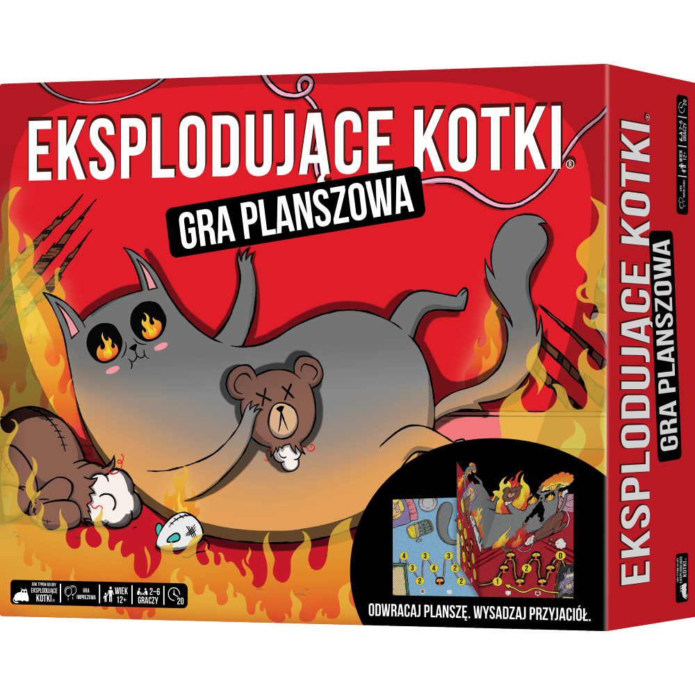 Jedna z najlepiej sprzedających się gier karcianych wszech czasów jest teraz planszówką – i to taką, jakie świat jeszcze nie widział! Eksplodujące Kotki: Gra planszowa to nowa wersja imprezowego hitu, w którym próbujemy odnaleźć się w zmiennej sytuacji i zastawiać przemyślane pułapki na przyjaciół. Znajdziemy tu zarówno znajome efekty, jak i zupełnie nowe rozwiązania, a wybuchnięcie może okazać się całkiem kuszącą opcją…