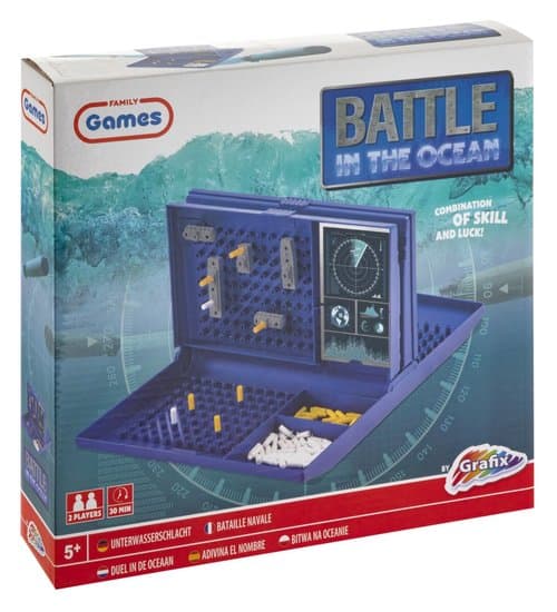 "Gra w statki Gra jest bardzo wciągająca i zapewnia świetną zabawę, oraz uczy strategicznego myślenia. Zasady gry są proste - każdy gracz rozmieszcza własne statki na planszy po swojej stronie. Statki nie mogą się stykać (musi być między nimi przynajmniej odstęp jednego pola). Następnie po kolei, gracze ""strzelają"" w pole przeciwnika - np. mówią pole ""A4"" - jeśli przeciwnik na tym polu posiada swój statek, mówi ""trafiony zatopiony"" i gracz zaznacza kolorowym słupkiem dane pole i ma prawo do jeszcze jednego typowania pola dzięki temu, że trafił (tak długo, aż trafi na puste pole przeciwnika, który mówi ""pudło"" i teraz on typuje pole).Gra się kończy, gdy jeden z graczy zatopi wszystkie statki przeciwnika. Plansza gry jest zamykana. Dzięki temu, po skończeniu zabawy można wszystko zamknąć bez gubienia pojedynczych elementów gry. Po zamknięciu zajmuje niewiele miejsca i łatwo ją przechowywać. Wymiary opakowania: 28 x 30 x 6 cm. Wiek: 6+"