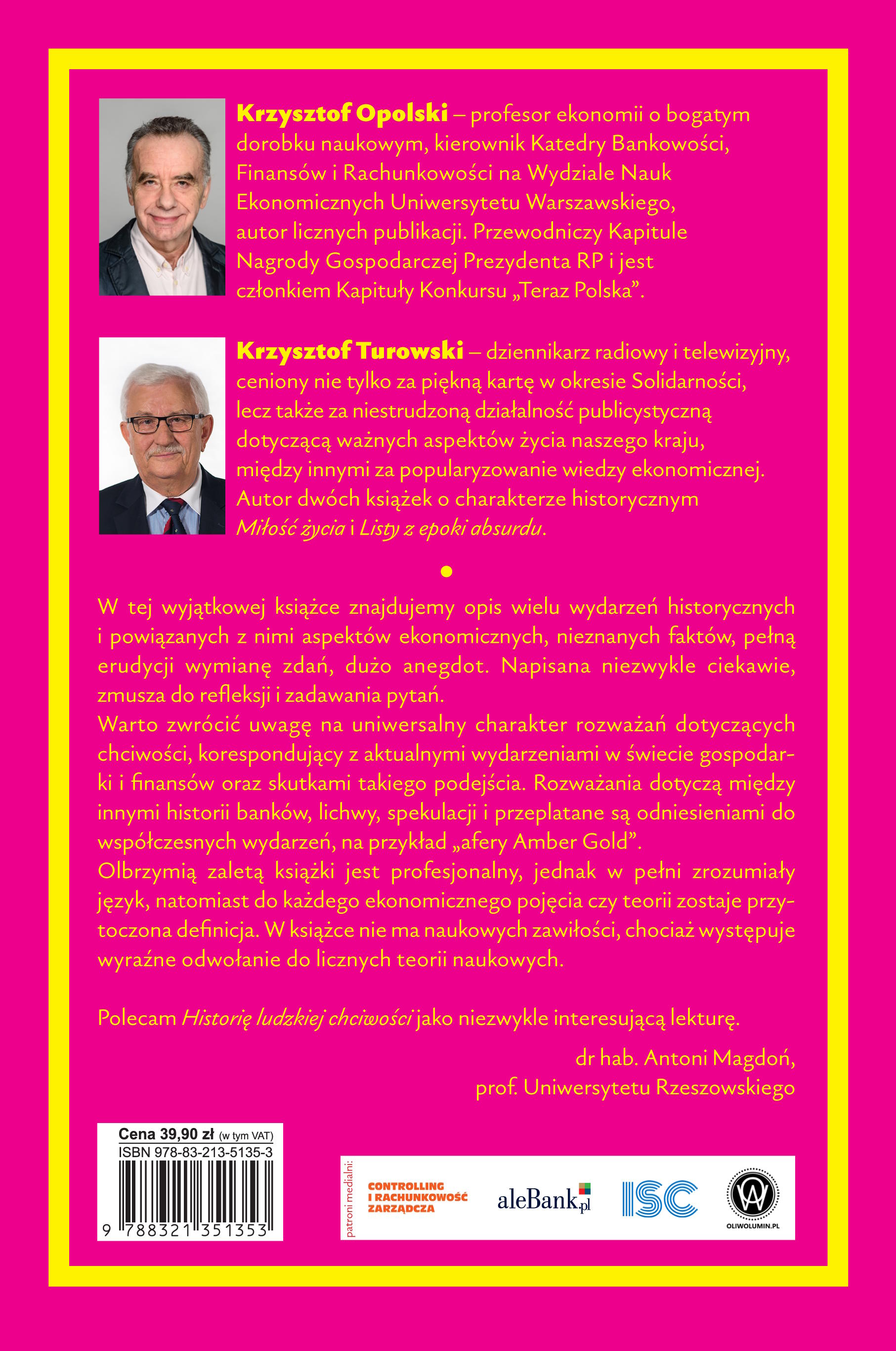 To dobra książka na trudne czasy. Znany ekonomista profesor Krzysztof Opolski i dziennikarz Krzysztof Turowski rozmawiają o jednej z ludzkich przywar – chciwości. Czytając tę wymianę zdań erudyty i eksperta, pełną anegdot i odwołań do znanych i nieznanych zdarzeń, poznajemy mechanizmy rządzące światem finansów od starożytności po dzień dzisiejszy. Skąd wziął się pieniądz? Kiedy zaczęto wyceniać wartość pracy ludzkiej? Kiedy powstał pierwszy bank? Co to jest spekulacja? Co kształtuje współczesny świat finansów? Po lekturze tej książki zawiłe teorie i pojęcia ekonomiczne staną się zrozumiałe, a i na bieżące wydarzenia spojrzymy z większym zrozumieniem. Oto fragment recenzji dr hab. Antoniego Magdonia, prof. Uniwersytetu Rzeszowskiego, zamieszczonej na czwartej stronie okładki. „W tej wyjątkowej książce znajdujemy opis wielu wydarzeń historycznych i powiązanych z nimi aspektów ekonomicznych, nieznanych faktów, pełne erudycji wymiany zdań, dużo anegdot. Napisana niezwykle ciekawie, zmusza do refleksji i zadawania pytań. Warto zwrócić uwagę na uniwersalny charakter rozważań dotyczących chciwości, korespondujący z aktualnymi wydarzeniami w świecie gospodarki i finansów oraz skutkami takiego podejścia. Rozważania dotyczą między innymi historii banków, lichwy, spekulacji i przeplatane są odniesieniami do współczesnych wydarzeń, na przykład „afery Amberd Gold”. Olbrzymią zaletą książki jest profesjonalny, jednak w pełni zrozumiały język, natomiast do każdego ekonomicznego pojęcia czy teorii zostaje przytoczona definicja. W książce nie ma naukowych zawiłości, chociaż występuje wyraźnie odwołanie do licznych teorii naukowych. Polecam Historię ludzkiej chciwości jako niezwykle interesującą lekturę”.Szczegółowe informacje na temat książki Historia ludzkiej chciwości