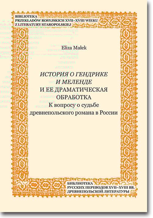 Szósty tom BIBLIOTEKI PRZEKŁADÓW ROSYJSKICH XVII–XVIII WIEKU Z LITERATURY STAROPOLSKIEJ został poświęcony nie zachowanemu do naszych czasów staropolskiemu romansowi o Henryku i Melendzie. Tłumaczenie rosyjskie z przełomu XVII i XVIII stulecia pozwoliło zrekonstruować fabułę zabytku. Interesująca okazała się również recepcja romansu na gruncie rosyjskim: doczekał się on kilku redakcji, a w latach 1720-tych, podobnie jak Historyja o Meluzynie i inne romanse tłumaczone z języka polskiego, został wykorzystany przez anonimowego twórcę Komedii o Indriku i Melendzie. W Aneksach do części analitycznej monografii zamieszczono nigdy dotąd nie publikowane teksty trzech redakcji przekładu Historyi o sławnym i walecznym Henryku i nadobnej Melendzie.