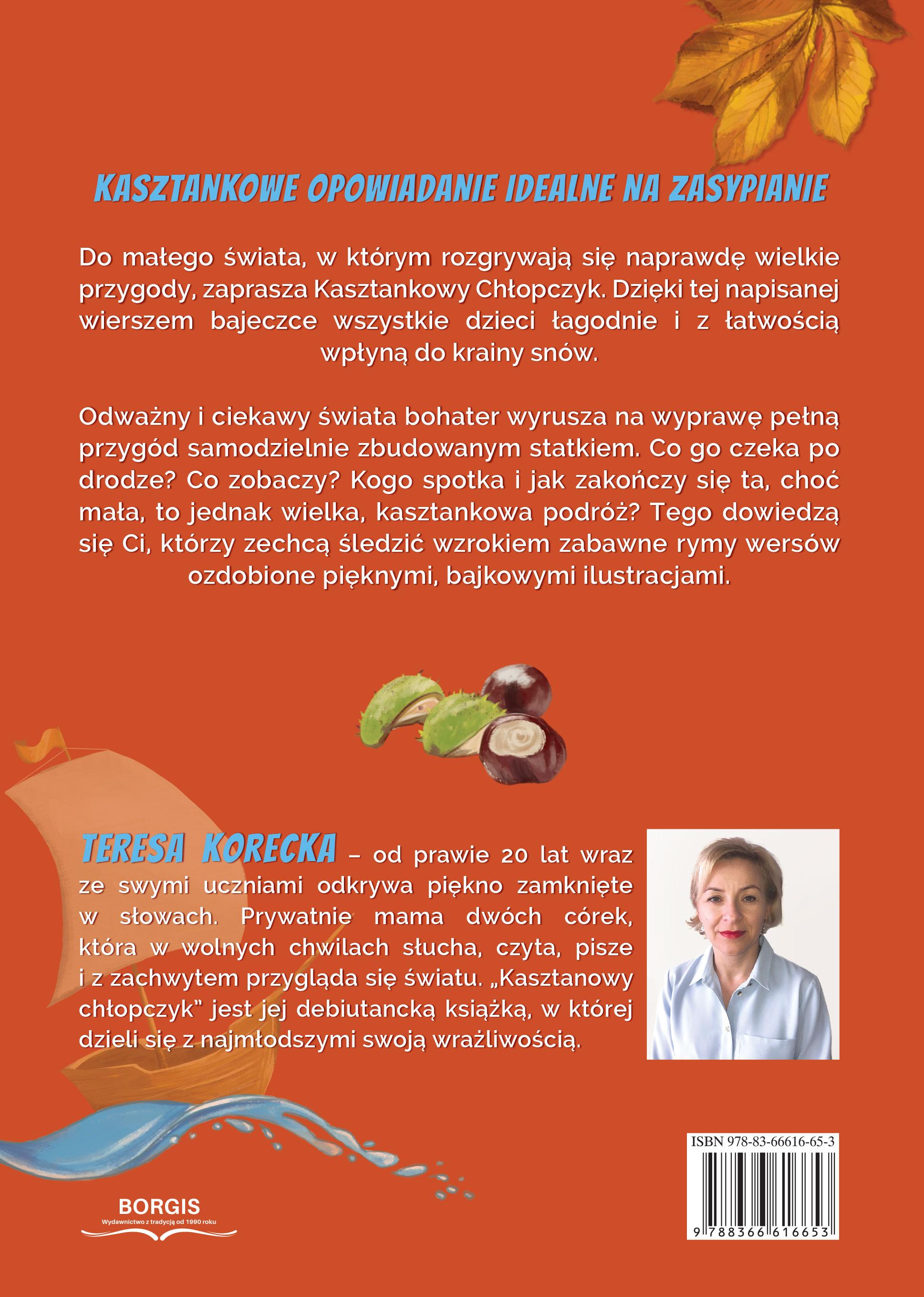 Kasztankowe opowiadanie idealne na zasypianie! Do małego świata, w którym rozgrywają się naprawdę wielkie przygody, zaprasza Kasztankowy Chłopczyk. Dzięki tej napisanej wierszem bajeczce wszystkie dzieci łagodnie i z łatwością wpłyną do krainy snów. Odważny i ciekawy świata bohater wyrusza na wyprawę pełną przygód samodzielnie zbudowanym statkiem. Co go czeka po drodze? Co zobaczy? Kogo spotka i jak zakończy się ta, choć mała, to jednak wielka, kasztankowa podróż? Tego dowiedzą się Ci, którzy zechcą śledzić wzrokiem zabawne rymy wersów ozdobione pięknymi, bajkowymi ilustracjami.Szczegółowe informacje na temat książki Kasztanowy chłopczyk