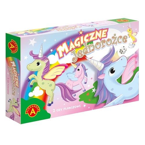 Magiczne Jednorożce to dwie gry planszowe pod wspólnym tytułem, skierowane do młodszych dzieci. Zasady gier są bardzo proste, ale cel jest różny. W pierwszej grze gracze - Jednorożce starają się zebrać jak najszybciej 10 gwiazdek, by rozświetlić nocne niebo. W tej grze dodatkową dawkę emocji daje możliwość wyboru, która łączy się jednak z ryzykiem. W drugiej grze Jednorożce wybierają się w podróż. Droga jest pełna emocjonujących niespodzianek, które mogą zdecydować o szybkości dotarcia do celu. W tej grze wygra Jednorożec, który pierwszy stanie na mecie. Obie gry to gwarancja dobrej zabawy i wielu emocji. Liczba graczy 2-4 Wiek 5+