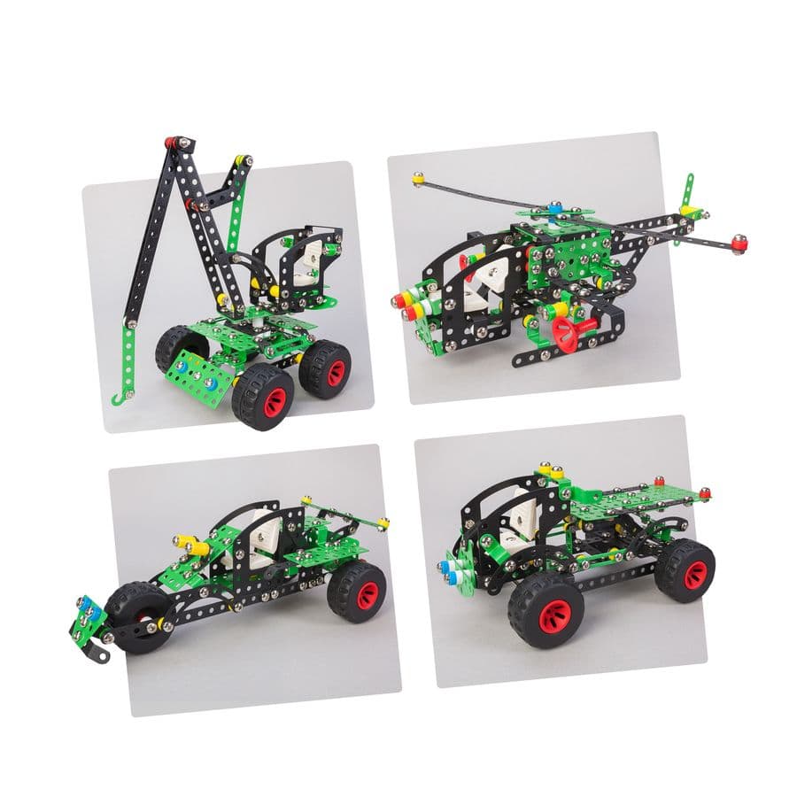 Wyjątkowy zestaw konstrukcyjny składający się 443 elementów w postaci kolorowych blaszek, śrubek, nasadek, elementów z tworzywa typu koła. Dzięki zawartym w zestawie narzędziom można samodzielnie zbudować mantę oraz 4 inne maszyny: dźwig, helikopter, lawetę i wyścigówkę. Model po złożeniu jest trwałay i swobodnie może służyć do dalszej zabawy.