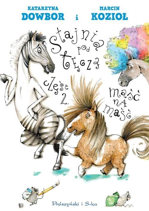 Uwaga! W „Stajni pod tęczą” pojawią się nowi mieszkańcy. Państwo pozwolą, że dokonamy prezentacji: Duet Lorneta i Rakieta! W „Stajni pod tęczą” wszystko po staremu. Tylko Lukrecja została przeniesiona do boksu obok Niunia, kiedy stało się jasne, że została jego arabską księżniczką na dobre i na złe. Niby nic się nie dzieje, aż tu nagle stukot kopyt przed wrotami Stajni zapowiada pojawienie się gości. Pierwszy z nich, choć przypomina konia, pokryty jest pasami. Na dodatek tylko w połowie. Ciotka Konstancja nie wita go z sympatią. Podobnie zresztą jak towarzyszącego mu roztańczonego kuca. Bo Ciotka dla zasady nie lubi obcych. I nie ceni innych ras – poza swoją. A przecież nikt z nas nie ma wpływu na to, jakiej jest rasy, skąd pochodzi i jak wygląda. Inni mieszkańcy Stajni, z wyjątkiem Ciotki, także nie widzą powodu do wstydu z powodu rasy albo tego, że jeden jest myszaty, inny ma białą skarpetkę, a jeszcze inny łysinę. Zaraz, zaraz – skarpetka, łysina? Wy pewnie w ogóle nie wiecie, o czym my mówimy… Nie martwcie się, wszystko wyjaśni się dzięki filmom, które przygotowała dla czytelników pani Kasia, właścicielka „Stajni pod tęczą”. Poznacie też przebieg brawurowej akcji drużyny mysich agentów pod dowództwem mysiora Geniusza. I dowiecie się, czy Ciotka Konstancja pozbyła się pewnej dziwnej choroby i zmieniła swój stosunek do obcych. Marcin Kozioł jest autorem wielu książek dla dzieci i młodzieży, w tym lektury szkolnej (dla klas 4-6) – "Skrzynia Władcy Piorunów" i jej kontynuacji "Tajemnica przeklętej harfy" Prowadzi rezerwat starych komputerów, a swoje zainteresowanie nimi opisał w książce "Szalona historia komputerów".Zapalony podróżnik, wielbiciel koni, ostatnio przejechał konno Kaukaz Mały. Kiedy miał 16 lat zdobył magiczne stypendium i wyjechał do Szkocji, by uczyć się w Gordonstoun – szkole, która była pierwowzorem Hogwartu, szkoły Harrego Pottera. Pewnie dlatego często pozwala sobie na odrobinę fantazji, którą zapisuje w sposób niepowtarzalny. Katarzyna Dowbor – z wykształcenia pedagog, z zawodu dziennikarka, prezenterka radiowa i telewizyjna. Od 2013 roku jest związana z telewizją Polsat. Od lat jest aktywną amazonką i przyczynia się do popularyzacji sportów konnych. Jest pomysłodawczynią organizacji Jeździeckich Mistrzostw Gwiazd, które odbywają się w Zakrzowie k. Kędzierzyna-Koźla od 1998 roku. Ma liczną domową gromadkę: koty – Fionę i Yeagera, psy – Pepe (odgrywającego jedną z głównych ról w książkach z serii "Stajnia pod tęczą") i Benia. W zbudowanej obok własnego domu stajni mieszkają klacz Rodezja i hucułka Surma. Pani Kasia uwielbia jeździć konno.