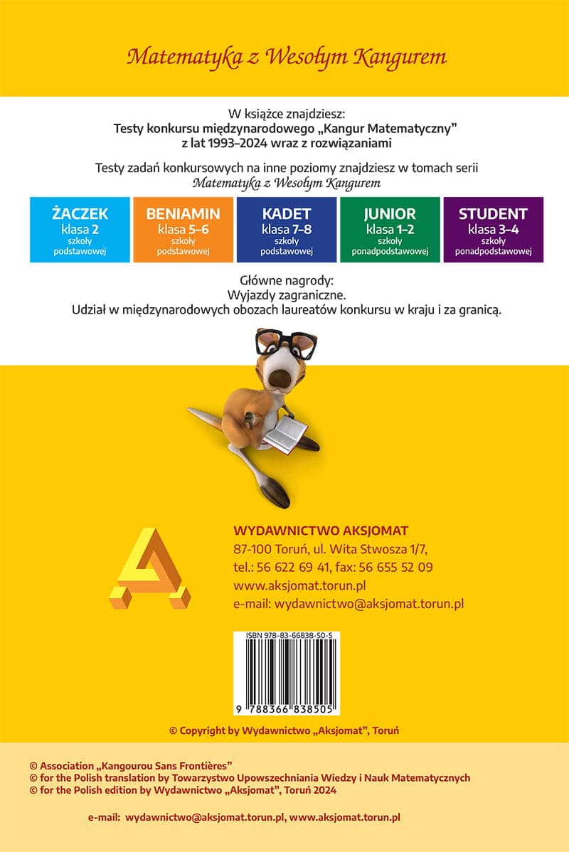 Testy konkursu międzynarodowego "KANGUR MATEMATYCZNY" wraz z rozwiązaniami, począwszy od 1992 do 2024 roku dla poziomu wiekowego "MALUCH" (klasy 3 i 4 szkół podstawowych) . Całkiem nowy, ciekawy i kolorowy skład. Testy zadań konkursowych na inne poziomy znajdziesz w kolejnych tomach serii "Matematyka z wesołym Kangurem". Ta książka jest następcą tzw. "żółtego" kangura, który począwszy od roku 2015 został rozdzielony na dwie książki - osobną dla poziomu Maluch i Beniamin.