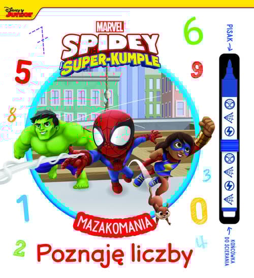 Ucz się rozpoznawać i pisać cyfry z suchościeralnym mazakiem W książce znajdują się zadania, dzięki którym dziecko poznaje cyfry od 1 do 9 i utrwala ich zapis. W środku mnóstwo aktywności do wykonania – labirynty, pisanie po śladzie, szlaczki i wiele więcej. Przy każdej z prezentowanych w książce cyfr są narysowane strzałki wskazujące na kolejność ruchów przy pisaniu – to duże ułatwienie, zwłaszcza na początku, kiedy dopiero uczymy się pisać. Każda cyfra jest wykropkowana, dzięki czemu można wodzić palcem po przerywanych liniach i pisać po nich flamastrem. Do książki dołączony jest suchościeralny mazak, który umożliwia wykonywanie tych samych ćwiczeń wielokrotnie. Zadania są osadzone w świecie Pajęczej Drużyny znanej z serialu animowanego Disney Junior – Spidey i super-kumple. Szukaj wskazówek, łap złoczyńców i wykonuj inne misje w towarzystwie superbohaterów. Rysuj, pisz i zmazuj, i pamiętaj, że trening czyni mistrza!