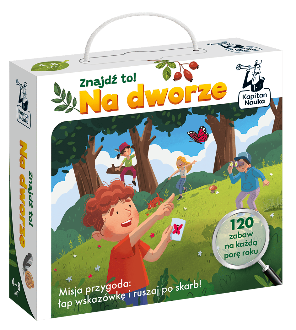 Znajdź to! Na dworze to zestaw 120 zabaw, które idealnie sprawdzą się w plenerze – na spacerze, pikniku, przyjęciu urodzinowym czy w grze w podchody. Dzięki nim dzieci spędzą wartościowy czas na świeżym powietrzu, a przy okazji rozwiną kreatywność i myślenie logiczne.