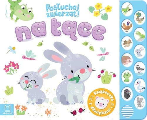 Książeczka z dźwiękami dla małych miłośników zwierząt, a w niej bogate, pastelowe ilustracje odpowiednie dla małych dzieci i krótkie, wpadające w ucho wierszyki o lubianych przez dzieci zwierzakach. Miłą niespodzianką są dołączone dźwięki zwierząt z łąki. Można posłuchać, jakie odgłosy wydają: pasikonik, kaczka, bażant, jaszczurka, przepiórki, zające, jeż, czajka, żaby, bocian, kret, myszy. Naciśnij przycisk z obrazkiem, aby włączyć dźwięk. Chcesz wyłączyć? Naciśnij przycisk jeszcze raz. Zabawa z książką rozwija zmysły malucha. Wesołe i łatwe do zapamiętania wierszyki rozwijają pamięć i percepcję dziecka, które wzbogaca również swoją wiedzę o odgłosy wydawane przez zwierzęta z łąki. Twarda oprawa i kartonowe karty sprawiają, że książka jest trwała i bezpieczna, a format odpowiedni dla małego dziecka. Posłuchaj zwierząt to książka do czytania, słuchania i oglądania!