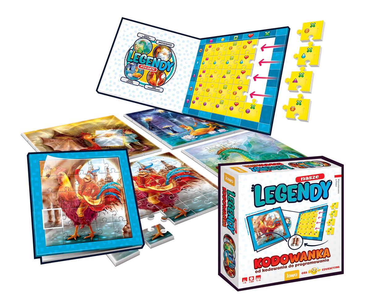 Od kodowania do programowania. Kodowanka zawiera obrazki przedstawiające scenki z czterech legend: Bazyliszek, Złota Kaczka, Pan Twardowski, Smok Wawelski. Obrazki zostały podzielone na 25 kwadratowych elementów. Z tyłu, na koszulce każdego elementu znajduje się kod na kolorowym tle - każda legenda ma swój kolor. Należy umieścić w książeczce wszystkie elementy jednego koloru według kodów. Jeżeli elementy zostaną prawidłowo ułożone, po zamknięciu książeczki i odwróceniu jej w okienku pojawi się obrazek z legendy. Na końcu instrukcji znajdują się krótkie opisy czterech legend. Przed rozpoczęciem kodowania proponujemy przeczytanie dziecku opisu wybranej legendy. Wiek graczy: 4+ Liczba graczy: 1-4 Czas rozgrywki: 30 minut