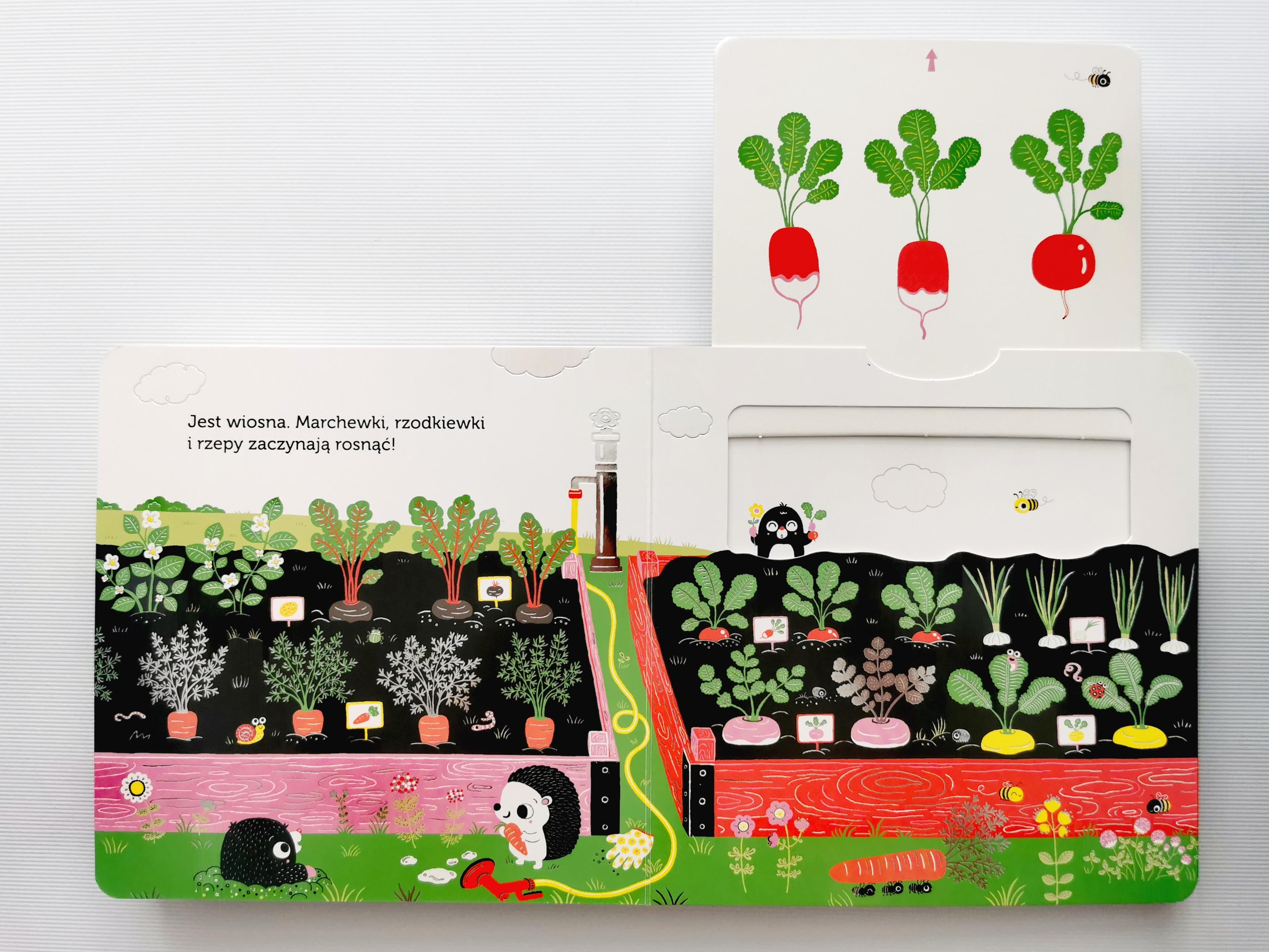 Ogródek Warzywny z serii Niesamowity spacer to książeczka dla najmłodszych z ruchomymi elementami oraz srebrnymi tłoczeniami. Kontrastowa kolorystyka oraz uproszczona forma ułatwią zapamiętywanie poszczególnych słówek, poprzez skojarzenie ich z otaczającą dzieci rzeczywistością. Grube, solidne strony zapewnią wytrzymałość oraz długie użytkowanie, wspomagając rozwój manualny małych rączek. W książeczce Ogródek warzywny nasz czytelnik poznaje warzywa, które można uprawiać na grządkach oraz zwierzątka, które lubią chrupać zielone przysmaki. Mały króliczek podjada liście kapusty, a krecik zajada się marchewkami i rzodkiewkami. Obok warzyw rośnie także wiele kolorowych kwiatów, które zapylają pszczółki oraz na których płatkach przysiadają kolorowe motyle. Niezaprzeczalnym atutem serii książeczek „Akademia mądrego dziecka. Niesamowity spacer” są ruchome elementy, odkrywające przed maluchami odpowiedzi na umieszczone w książce pytania oraz zmieniające wygląd poszczególnych ilustracji. Taka forma łączy zabawę z nauką i intryguje dzieciaki, zachęcając je do samodzielnego sięgania po lekturę. Książeczka edukacyjna świetnie sprawdzi się podczas poznawania prostych słów, nazw przedmiotów i ich przeznaczenia.