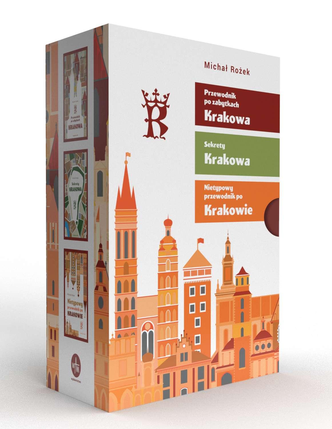 Box zawiera książki: Sekrety Krakowa, Przewodnik po zabytkach Krakowa, Nietypowy przewodnik po Krakowie.