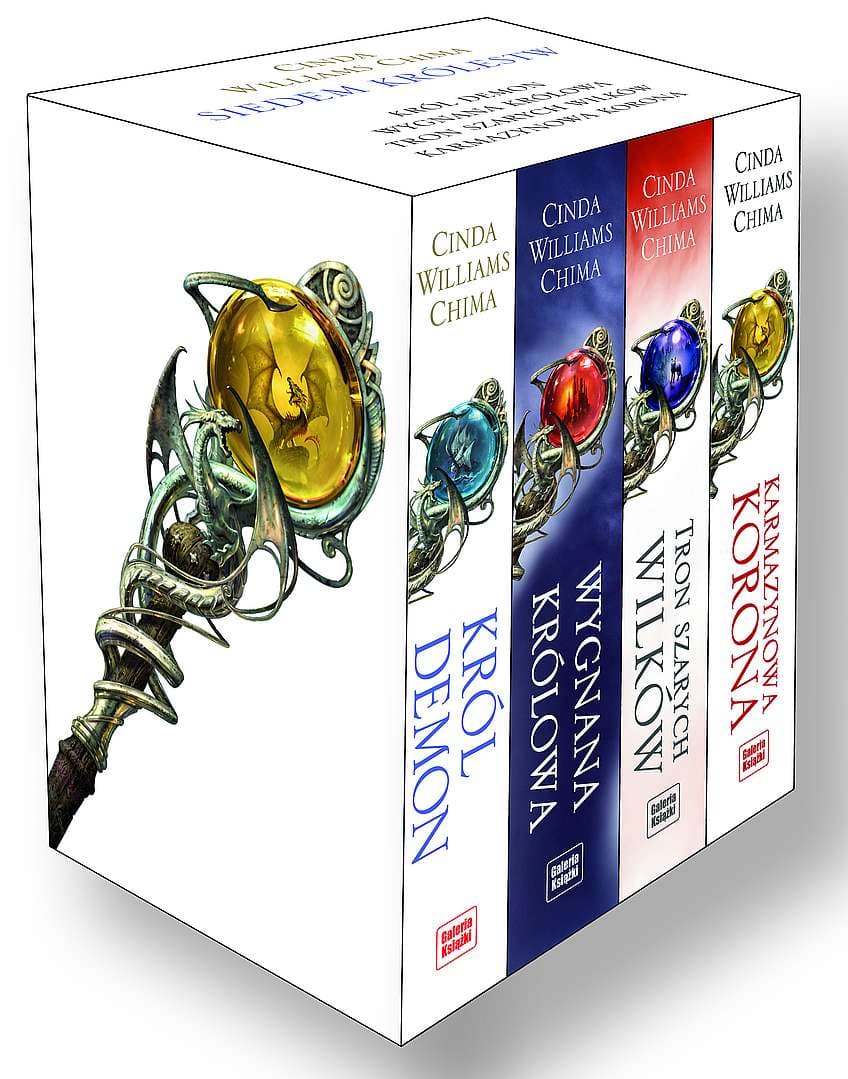 Pakiet zawierający 4 tomy bestsellerowej serii "Siedem Królestw" autorstwa Cindy Williams Chimy, w specjalnie zaprojektowanym etui: Król Demon, Wygnana królowa, Tron Szarych Wilków, Karmazynowa Korona.
