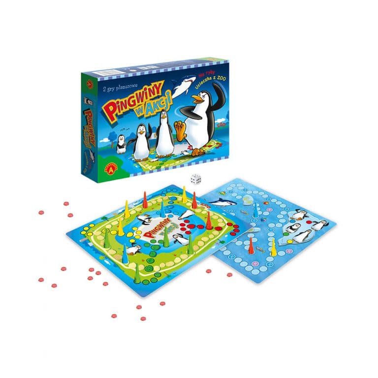 "Pingwiny w akcji" to 2 gry planszowe. Pierwsza gra - "Ucieczka z ZOO" polega na tym, że każdy z graczy ma swoją drużynę pingwinów, które chcą jak najszybciej wydostać się z ZOO. Zwycięzcą w tej grze zostanie gracz, który pierwszy przeprowadzi swoje pingwiny poza jego mury. W drugiej grze "Na ryby" pingwiny ruszają na połów ryb. Krążąc po torze planszy gracze starają się trafić jak najszybciej na pola, które premiowane są żetonem- czyli rybą. Zwycięży ten , kto zdobędzie najwięcej ryb. W czasie połowu trzeba jednak uważać, by nie dostać się w paszczę rekina. Zawartość pudełko: dwustronne plansze, 16 pionków, 23 żetonów, kostka do gry, instrukcja. 2-4 graczy Wiek: 4+