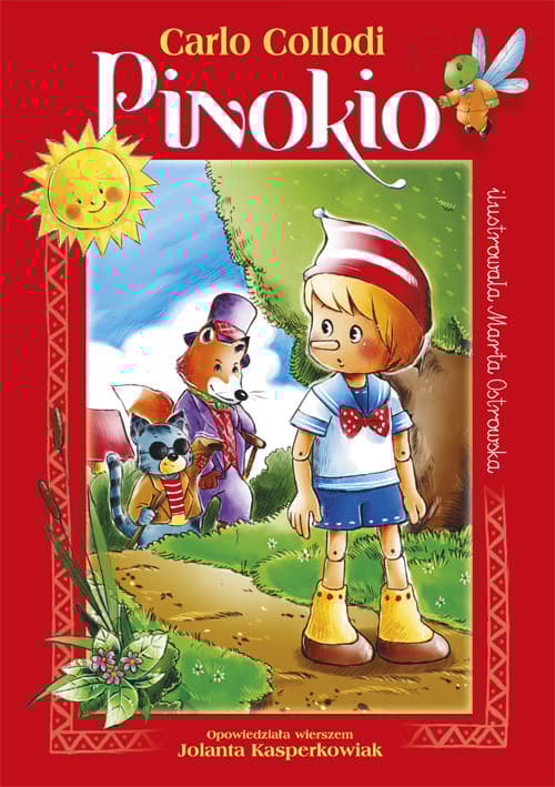 Powieść Carlo Collodiego od lat fascynuje czytelników. Autorka tego opracowania postanowiła przybliżyć postać Pinokia najmłodszym, dlatego opowiedziała o nim wierszem. Pinokio, pajacyk wystrugany z drewna, opuszcza starego Dżepetta i wyrusza w świat pełen niebezpieczeństw. Szukając przygód, spotyka na swej drodze wiele postaci, które wykorzystują jego naiwność, a te, które chcą jego dobra, często okłamuje. Kiedy zostaje ukarany i wyrastają mu ośle uszy, podejmuje dramatyczną próbę powrotu do ukochanego ojca. Jak skończy się podróż przez morze? Czy spełni się przepowiednia Dobrej Wróżki i Pinokio przemieni się w chłopca? Odpowiedzi szukajcie na kartach tej magicznej książki!