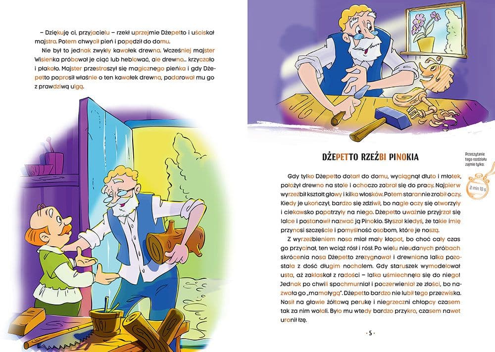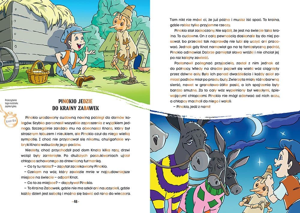 Przedstawiamy adaptację ponadczasowej powieści dla dzieci Pinokio Carla Collodiego w serii Czytanki metodą sylabową. Została ona przygotowana z myślą o dzieciach szlifujących umiejętność samodzielnego czytania i jest zgodna z zasadami metody sylabowej - uczy czytania sylabami, które w tekście wyszczególnione są dwoma kolorami druku na zmianę. Historia psotnego i nieposłusznego drewnianego pajaca, który marzy o zostaniu prawdziwym chłopcem, ale wciąż własny charakter staje mu na przeszkodzie, jest znana i kochana od pokoleń. Pajacyk przeżyje wiele przygód i niebezpieczeństw, nim nauczy się, co w życiu jest naprawdę ważne. Przygody Pinokia zostały zilustrowane barwnymi, pełnymi humoru ilustracjami, które uprzyjemnią lekturę. Książeczka pomoże każdemu maluchowi stać się mistrzem czytania!