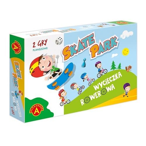 SKATE PARK to miejsce gdzie możesz się wyszaleć sprawdzając swoją sprawność i możliwości w akrobacjach na torze. Macie do wyboru jazdę na rowerze, rolkach, hulajno-dze lub deskorolce. Umiejętność wykonywania ewolucji jest zastąpiona w grze umiejętno-ścią, układania stosu z plastikowych żetonów. Ten, kto w zawodach wykaże się większą zręcznością, opanowaniem i cierpliwością zdobywając określoną liczbę żetonów zostanie zwycięzcą - jeśli przy odrobinie szczęścia ukończy jazdę bez straty wymaganych punktów. By tak się nie stało musisz uważać, by się nie przewrócić lub nie przemęczyć, bo konkurenci tylko czekają na Twój błąd. WYCIECZKA ROWEROWA - chętni na rowerową wyprawę mają do przejechania trasę w pięknym i zróżnicowanym krajobrazie. Każdy z uczestników wycieczki stara się w jej trakcie zauważyć jak najwięcej krajobrazowych atrakcji, przeżyć jak najwięcej emocjonujących spotkań ze zwierzętami, ale też zebrać po drodze jak najwięcej grzybów lub jagód, jeśli zdoła je zauważyć. Po drodze mogą przytrafić się również sytuacje, w których można spełnić dobry uczynek - co nie pozostanie bez nagrody. Zwycięzcą w grze zostanie uczestnik wyprawy, który dostrzeże wymaganą liczbę atrakcji i jako pierwszy powróci z wyprawy. Wiek graczy: 6+
