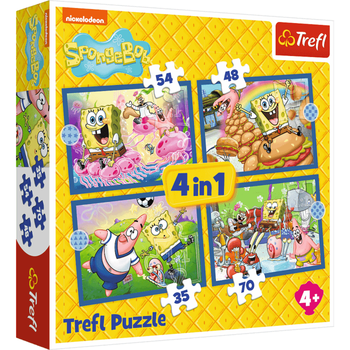 Podwodne życie SpongeBoba to 4 niezależne układanki dla dzieci, zaprojektowane z myślą o małych fanach przygód bohaterów bajki SpongeBob. Po ułożeniu puzzli powstaną 4 obrazki, z czego największy o wymiarach 285x205 mm.