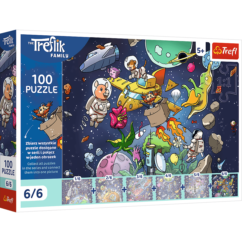 Wujcio w kosmosie (6/6), to puzzle 100 elementów i część niezwykłej kolekcji, która po złożeniu wszystkich sześciu zestawów tworzy jedną dużą, fascynującą ilustrację przedstawiającą międzyplanetarne przygody sympatycznej Rodziny Treflików.