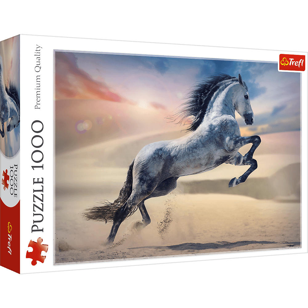 Puzzle Majestatyczny koń, składające się z 1000 elementów, przedstawiają biegnące po pustyni zwierzę, na tle zachodzącego słońca.