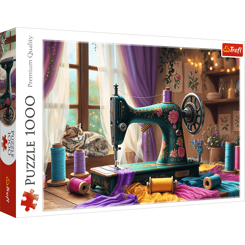 Puzzle Moja pracownia krawiecka, składające się z 1000 elementów, przedstawiają stanowisko do szycia na maszynie krawieckiej.