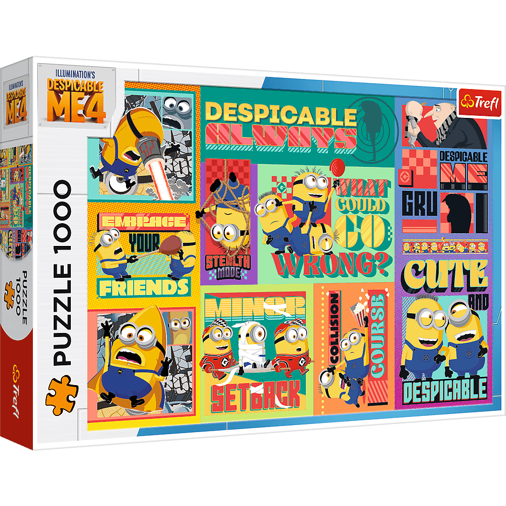 Puzzle Gru i Minionki: Pod Przykrywką, składające się z 1000 elementów, przedstawiają kolorowy kolaż z bohaterami animacji o tym samym tytule.