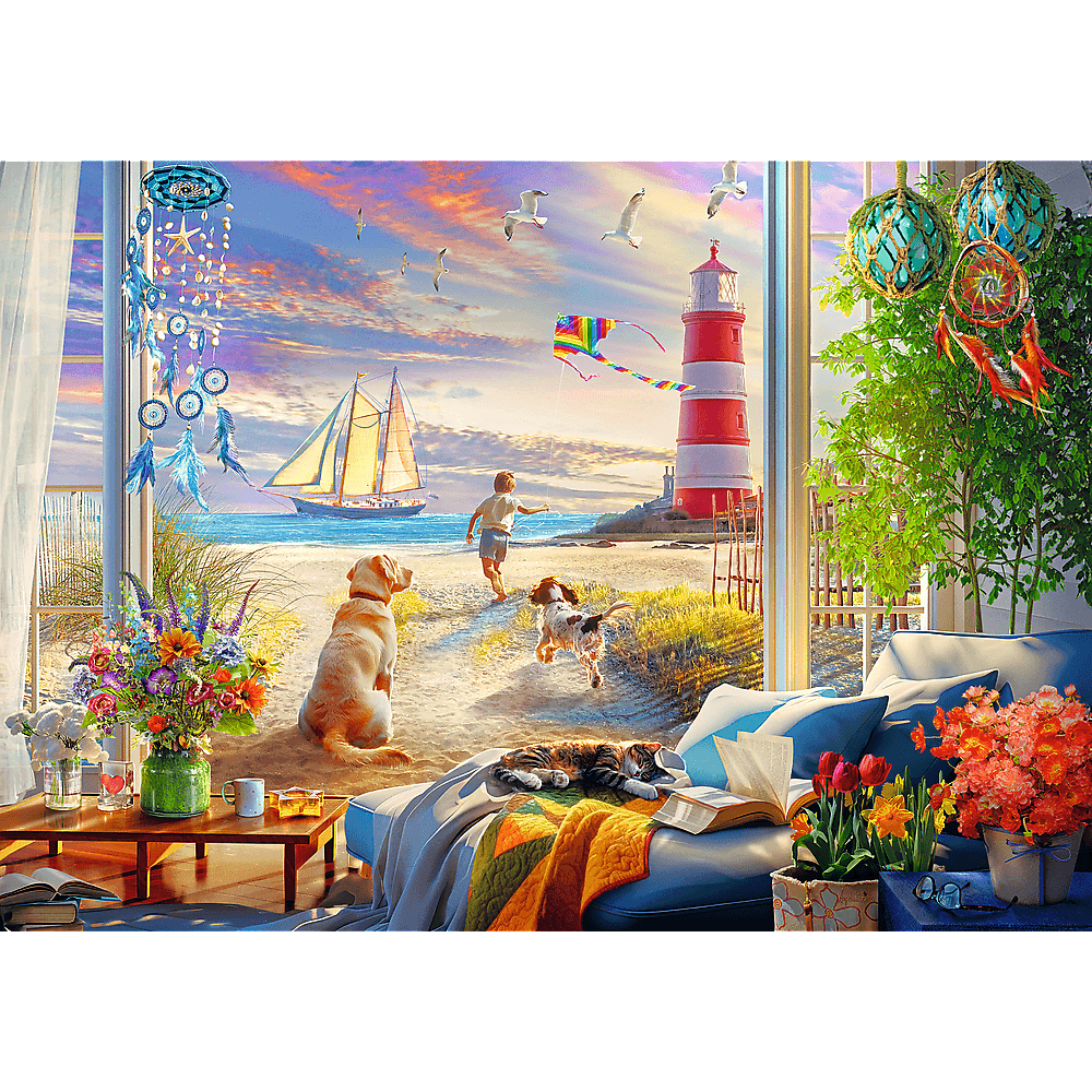 Puzzle Letnia bryza przedstawiają nadmorski klimat, z latarnią i żaglówką w tle.
