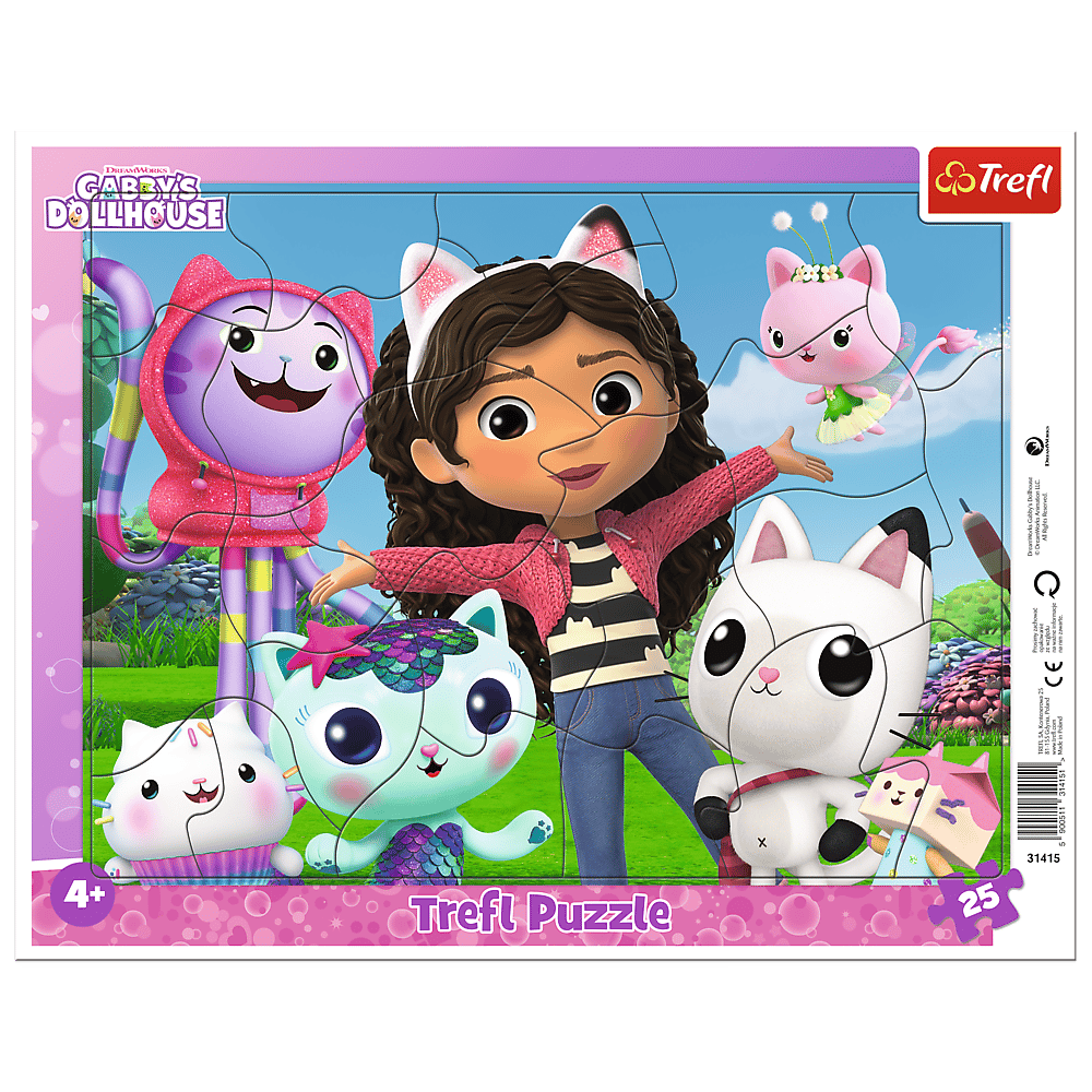 Poznaj Gabi to 25-elementowe puzzle dla dzieci od Trefl z motywem popularnej bajki Koci Domek Gabi. Puzzle przedstawiają główną bohaterkę, Gabi, wraz z jej przyjaciółmi — kotami.