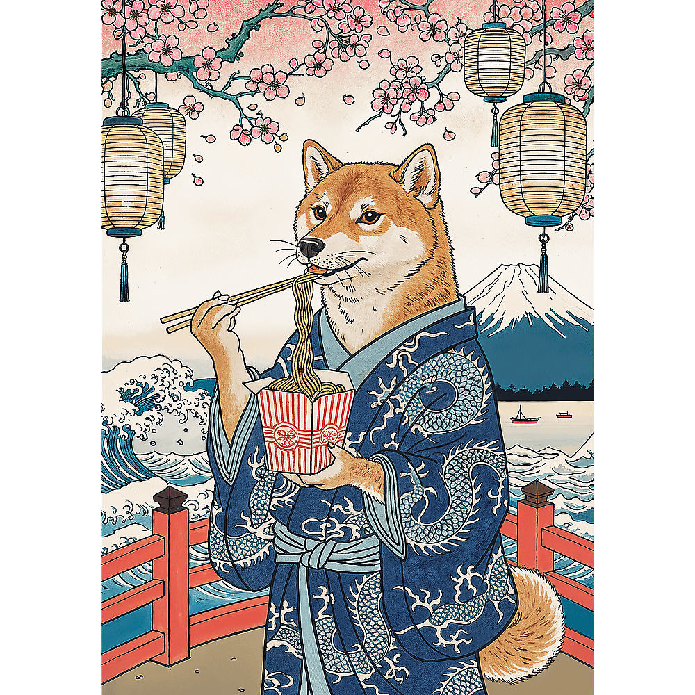 Puzzle Pets as Art: Makaronowa medytacja Shiby przedstawiają ubranego w tradycyjne kimono psa rasy Shiba, spokojnie jedzącego makaron pałeczkami na tle japońskiego krajobrazu. Po ich ułożeniu powstanie obraz o wymiarach 480x340 mm.