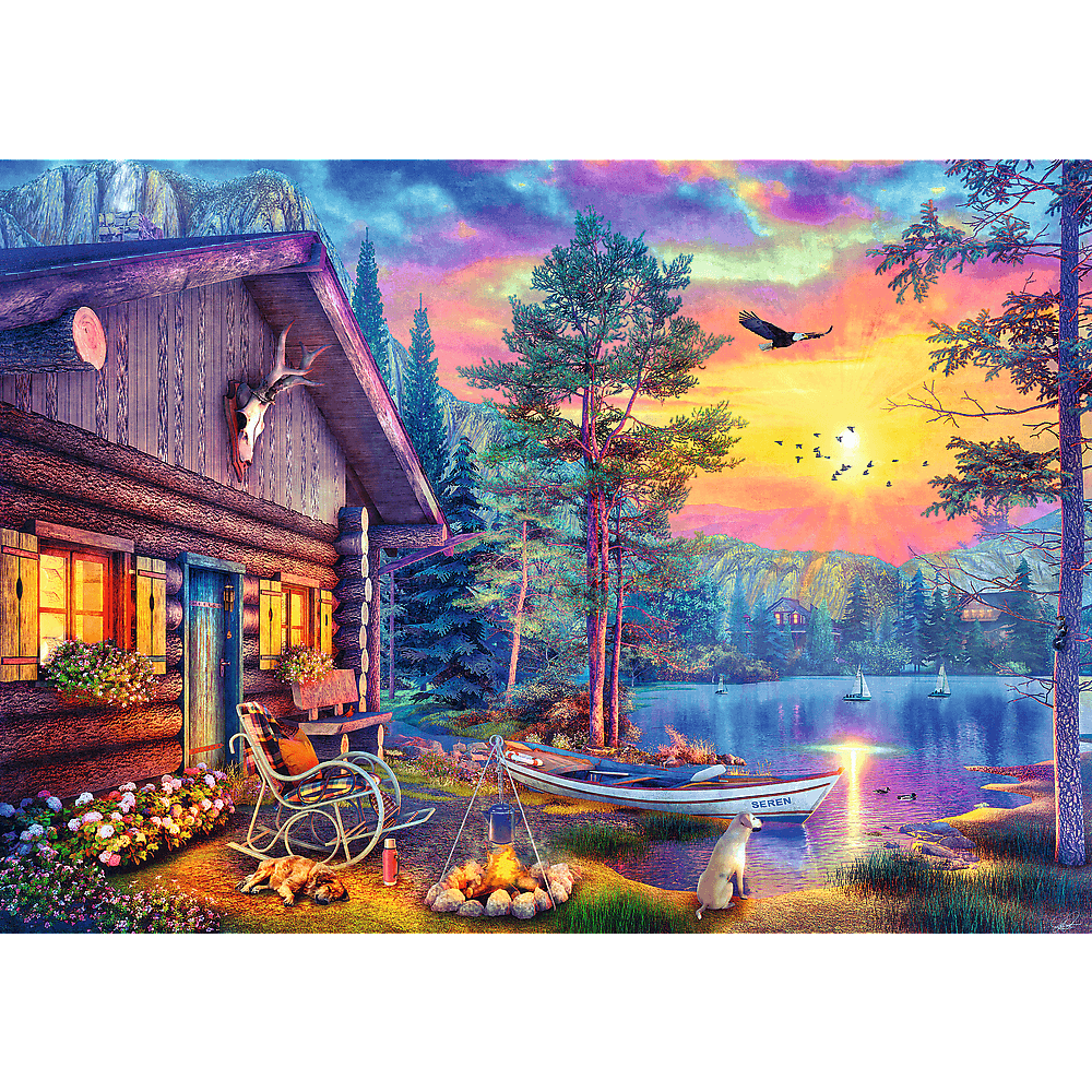 Puzzle Przystań o zachodzie słońca przedstawiają zachód słońca nad jeziorem, przy którym znajduje się drewniana chatka i przycumowana łódź. Po ich ułożeniu powstanie obraz o wymiarach 480x340 mm.
