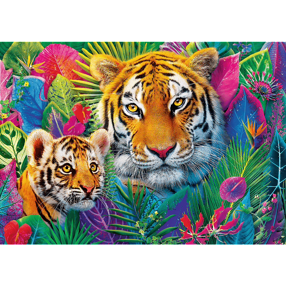 Puzzle Tygrysy w dżungli przedstawiają dwa tygrysy — dorosłego i młodego — ukryte wśród barwnej, gęstej tropikalnej roślinności.