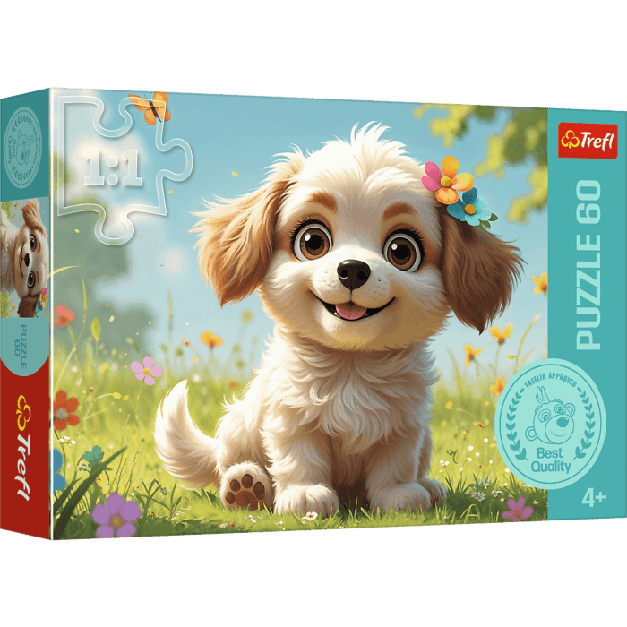 Szczeniaczkiem być! to puzzle składające się z 60 elementów, zaprojektowane z myślą o małych fanach zwierząt.