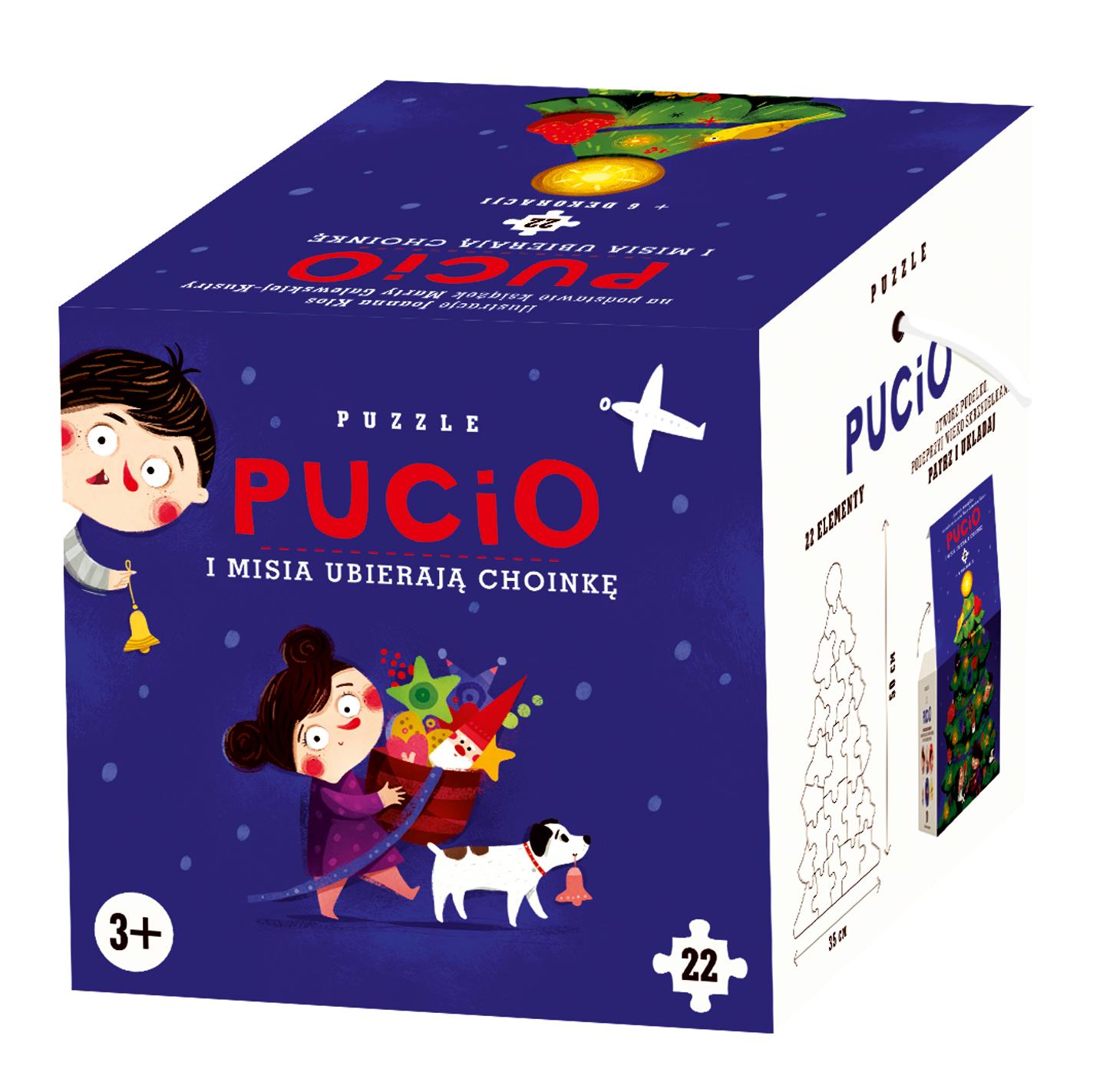 Do ułożenia jest duży obrazek w kształcie choinki. Opakowanie zawiera też niespodziankę: kilka tekturowych bombek z wizerunkami bohaterów książek o Puciu do zawieszenia na prawdziwym drzewku lub do przystrojenia wózka.