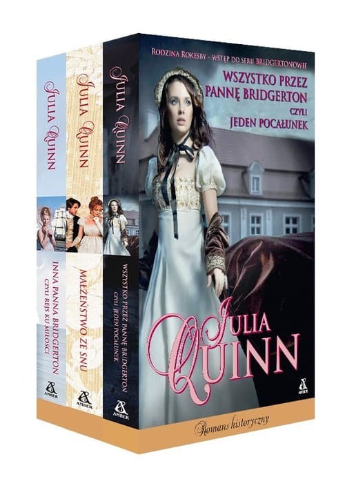 RODZINA ROKESBY - wstęp do serii BRIDGERTONOWIE W serii Rodzina Rokesby poznajemy wcześniejsze losy rodziny Bridgertonów. WSZYSTKO PRZEZ PANNĘ BRIDGERTON, CZYLI JEDEN POCAŁUNEK Wszyscy oczekują, że Billie Bridgerton poślubi jednego z braci Rokesby. Ich rody od wieków mieszkają w sąsiedztwie, w dzieciństwie Billie łaziła po drzewach z Edwardem i Andrew. To oczywiste, że jeden z nich będzie dla niej idealnym mężem... Co prawda jest jeszcze jeden brat – George Rokesby, najstarszy syn i dziedzic tytułu hrabiowskiego. Nadęty, arogancki, irytujący i – czego Billie jest absolutnie pewna – nie cierpi jej tak samo, jak ona jego. Ale oto nieznosząca się para zostaje uwięziona w najmniej romantycznym miejscu, jakie można sobie wyobrazić... Nadciąga noc... I zapierający dech w piersiach niespodziewany jeden pocałunek... MAŁŻEŃSTWO ZE SNU Cecilia Harcourt jest sierotą, a jej brat został ranny podczas wojny w koloniach. Teraz ma dwa wyjścia: oba nie do przyjęcia – zamieszkać z nielubianą ciotką lub wyjść za mąż za podstępnego kuzyna. Wybiera… trzeci wariant: podróż przez Atlantyk, by pielęgnować brata, dopóki nie wróci do zdrowia. Po tygodniu poszukiwań znajduje nie brata, ale jego najlepszego przyjaciela, przystojnego oficera. Edward Rokesby leży nieprzytomny i rozpaczliwie potrzebuje troskliwej opieki. Cecilia postanawia, że uratuje żołnierzowi życie, nawet jeśli znajdzie się u jego boku jedynie dzięki pewnemu kłamstwu… Ryzykuje całą swoją przyszłość. Kiedy jednak prawda wyjdzie na jaw, Edward może sprawić jej kilka niespodzianek… INNA PANNA BRIDGERTON, CZYLI REJS KU MIŁOŚCI Ona znalazła się w nieodpowiednim miejscu… On znalazł ją w nieodpowiednim czasie... Czy dwa fatalne zbiegi okoliczności mogą dać jeden ideał? Pełna temperamentu panna Poppy Bridgerton poślubi tylko mężczyznę interesującego, inteligentnego i żądnego przygód, jak ona sama. Niestety w londyńskich salonach jeszcze takiego nie spotkała. I oto podczas wizyty nad morzem natrafia na kryjówkę przemytników. Lecz rozkoszny dreszczyk emocji przeradza się w przerażenie, gdy Poppy zostaje porwana przez korsarzy i dostarczona na pokład ich okrętu – wprost do kajuty kapitana… Kapitan Andrew Rokesby od początku wie, że piękna dziewczyna w jego kajucie oznacza kłopoty. Nie przeczuwa jednak, że rozpoczyna rejs pełen przygód i niespodzianek. Zwłaszcza że oboje nie mogą wyjawić sobie całej prawdy… JULIA QUINN, autorka nr 1 na listach „New York Timesa”, nazywana jest współczesną Jane Austen. Jej romanse historyczne są tłumaczone na 29 języków, wydawane w milionowych nakładach i obsypywane nagrodami, w tym wielokrotnie RITA (odpowiednik filmowego Oscara).
